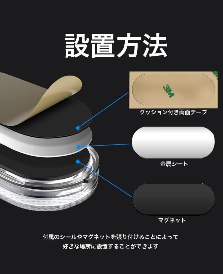 マグネットを利用して設置するので車内の天井や車のトランクなどに取り付けることができます。小型ライトや懐中電灯しても使うことができるので汎用性も高いです。車内ライトの目的だけじゃなく例えば寝室、室内灯、クローゼット、廊下などにもご使用いただけます。