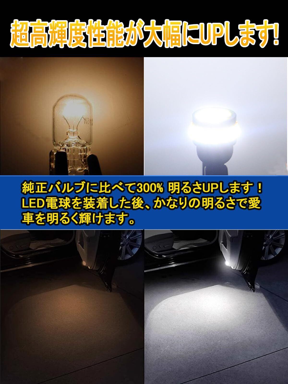 【明るさ2.5倍にアップ(従来品比べ)・ 安定した性能】T10 LEDは高い発光効率のLEDチップで囲まれ、市販品(T10)のハロゲンと比較して約80%の消費電力の省エネを実現でき、明るさは大幅にアップ!定電流回路内蔵、常に安定した照明、最適な拡散と圧倒的な明るさを実現!