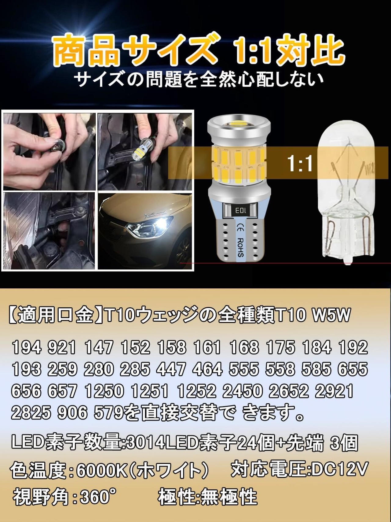 【革新的なT10 LED ホワイト】先端には高拡散レンズ&3チップLEDを搭載し、周囲には24個の3014 SMDチップがあり、均一な全方位拡散を実現している。隅々まで均一な光を当てる。360°全方位照射。透光性と集光性は大幅アップします。