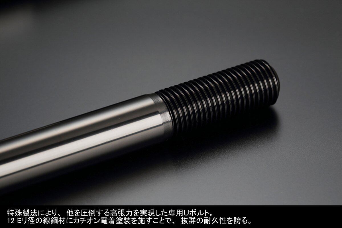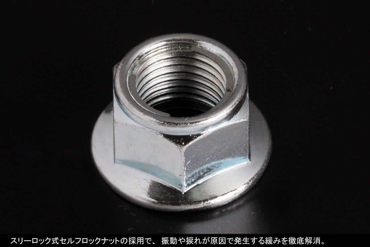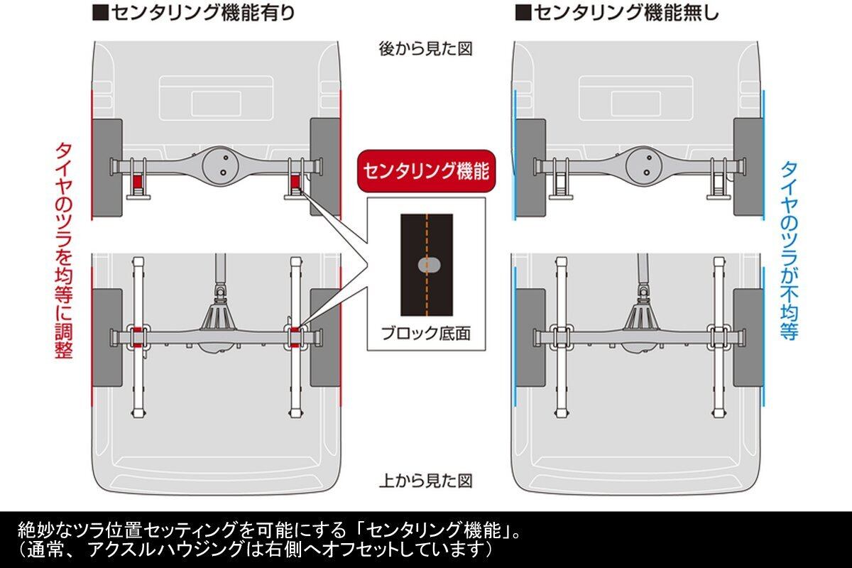 NV350をロ-ダウンする際に必要となるダウンブロックを多機能化することで、従来製品では補えなかった欠点を完全に克服しました。ブロック本体には、軽量かつ剛性に優れたA6061アルミ押出材を使用し、高精度の切削加工を施したのち、ショットブラストとブラックアルマイト処理で仕上げました。また、あらたな機能として、センターピンを円錐形状とした「フィッティングコーン」を採用。高張力を誇るUボルトとの組み合わせによる完璧なフィッティングを実現しました。さらに、前後方向のズレが原因で起こるアクスルハウジングの振れ(スラスト角)を抑制する「アクスルガイド」が、いかなる路面状況でも安定した直進性をサポートします。ほかにも、オフセットしたアクスルを車体のセンターへ調整し、絶妙なツラ位置セッティングを可能にする「センタリング機能」など、多彩なスペックを誇ります。ダウン量はシステムモデルを合わせると、0.5インチ(12.5ミリ)ごとに7種類のサイズを設定し、希望の車高へ確実にセットアップすることができます。