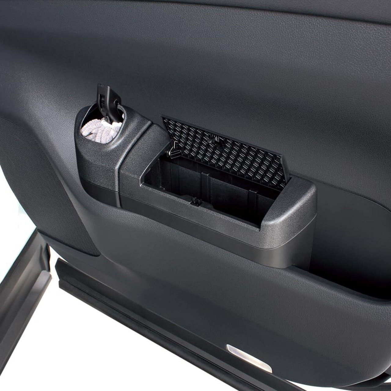 ●トヨタ40系アルファード・ヴェルファイア(AAHH4#/AGH4#/TAHA4#)の右ハンドル車の運転席側フロントドアポケット専用のゴミ箱&折りたたみ式ハンディーモップ(専用ケース付き)です。 ●専用設計で、運転席側フロントドアポケットにピッタリフィットします。 ●運転席側フロントドアポケットに入れるだけの簡単取り付けです。 ●フタを押すと開き、フタを閉じて押すとロックする構造で、簡単に開閉することができます。 ●フタにはダンパー方式を採用し、スムーズな動きで開きます。 ●たまったゴミは本製品のゴミ箱を上下分割して捨てることができます。 ●ホコリをしっかりキャッチする極細繊維のハンディーモップを付属しています。 ●本体は内装に合わせた革シボ調です。 ●ゴミ箱の容量は約1.3Lです。 【 購入前にご確認ください】 ■40系アルファード・ヴェルファイア(AAHH4#/AGH4#/TAHA4#)の右ハンドル車の運転席側専用です。 ■調査日(2023年5月現在)以降のマイナーチェンジ車には適合しない場合があります。 ■運転席側フロントドアポケットに追加オプションが装着されている車両へは取り付けできません。