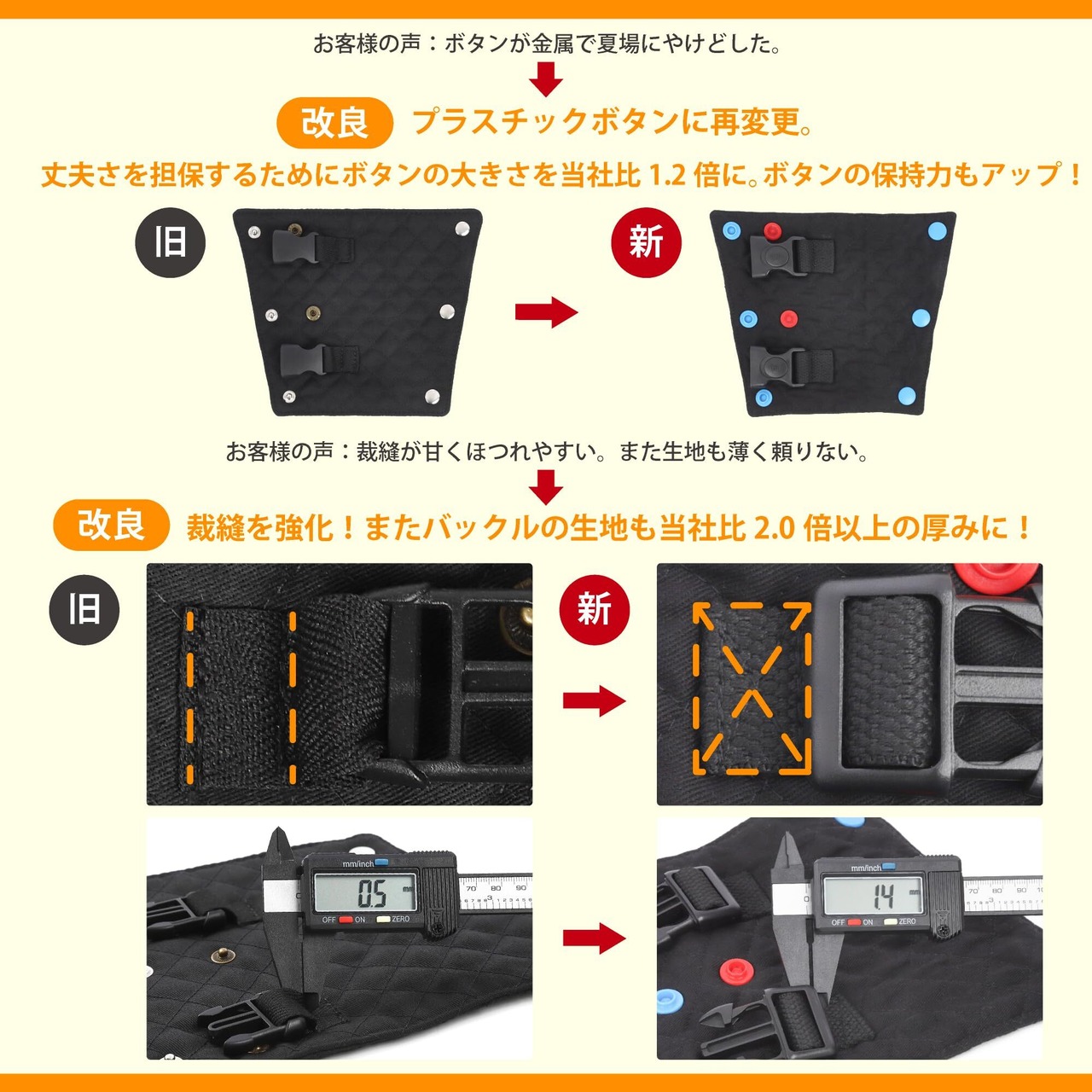 【ご好評いただいた商品の最終アップデート版!】バックルにロックをつけ、ボタンを大きいサイズにしたことで、チャイルドシートからの抜け出しがしにくく、末永くお使いいただける商品になりました。