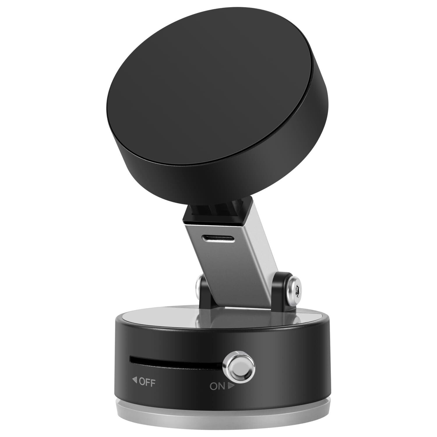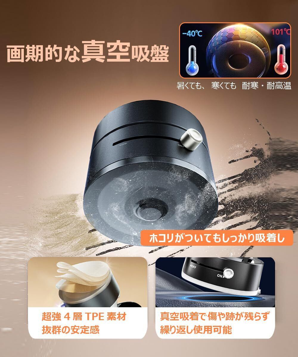 【マグネットと真空式の2WAY吸着】マグネットと真空吸着を組み合わせたため、最大1.5kgまで耐える強力な吸着力で、スマートフォンの落下も心配ありません。