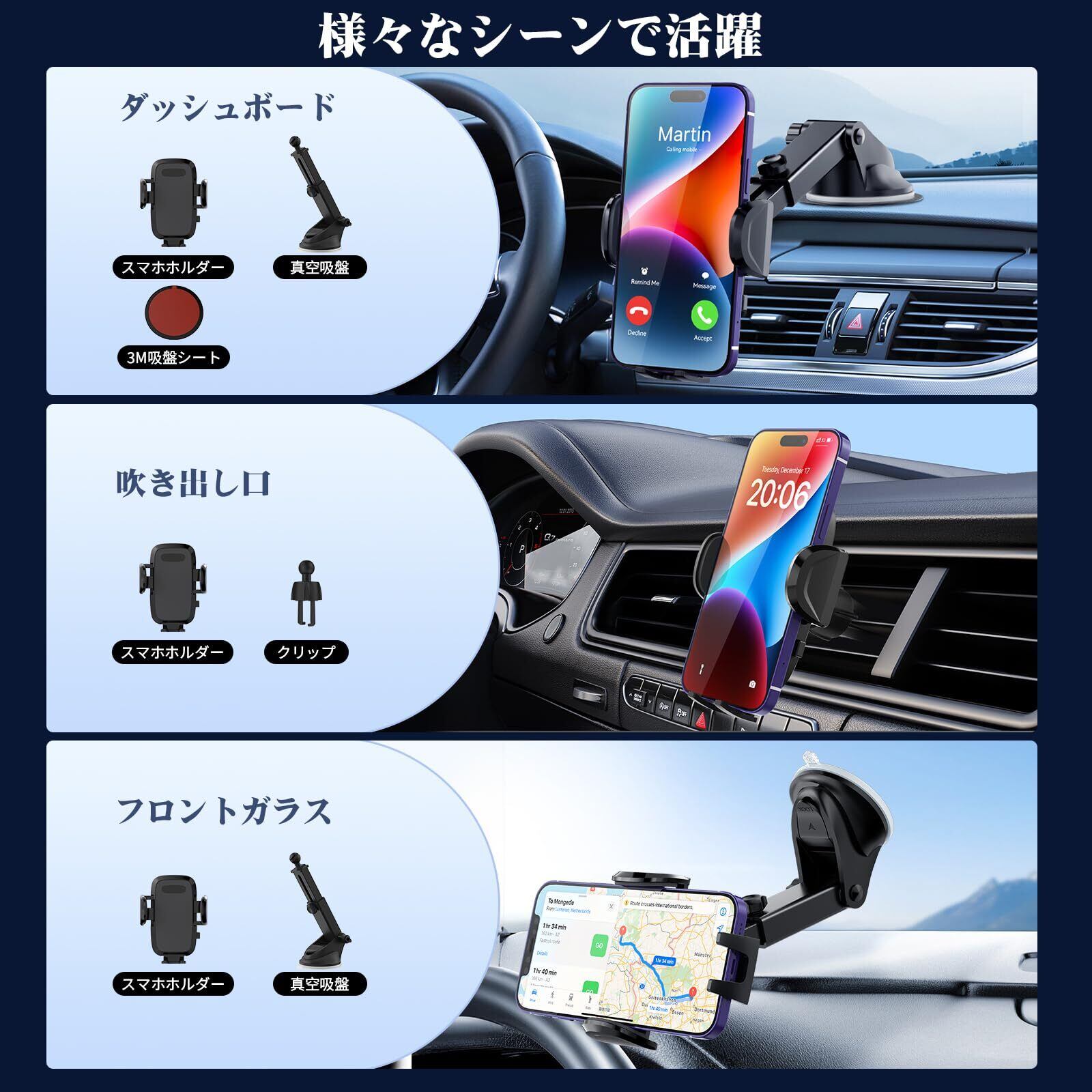 【超強力吸盤&安定性抜群】の車スマホホルダー は最新改良された超強力真空吸盤を採用、取り付け場所を自由に選べることで、ダッシュボードや窓など、平らな場所であればどこでも取り付けられます。 運転席だけでなく後部座席などに取り付けて子どもたちがスマホで動画を楽しめるように使えます。 また、携帯ホルダーの吸盤には耐熱性と耐寒性がある素材を追加しており、暑い時や極寒時で外れやすいの問題を有効的に防ぎます。 更に、吸盤が汚れて吸引力が弱くなった場合でも、水洗い後に乾燥させることで吸着力復元でき、何度でも使用することが可能。非常に経済的で実用的なカー用品です。プロドライバー大絶賛!