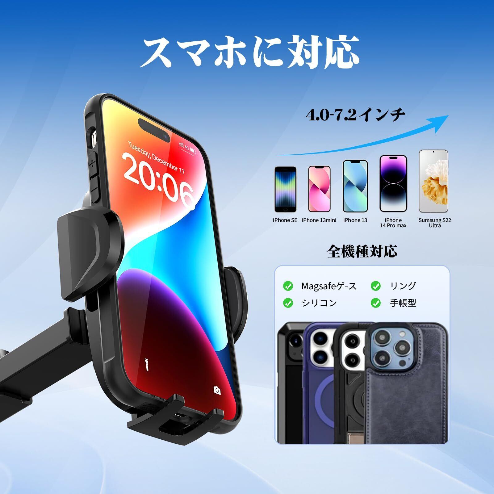 【多機種対応】 スマホ ホルダー 車載用は横幅5.5㎝-10.5㎝の端末に対応、下支えも1.6cm伸縮なので、iPhone/Samsung/Galaxy/Sony/Xperia/LG/SHARP/OPPO/AQUOSなど4-7.2インチ大画面のスマホも対応可能 、厚手の手帳型ケース、Magsafe対応ケース 、 シリコーン 、クリア(全透明) 、 ゴム 、レザー 、リング付きなど様々な機種に対応。ヨタ/日産/マツダ/スズキ/スバル/BMW/ホンダ/ジムニー/n-boxなど 99%の車種に適合。の車スマホホルダーの各部品も厳格なテストを完了しました。耐久性も安全性も全然心配ありません。