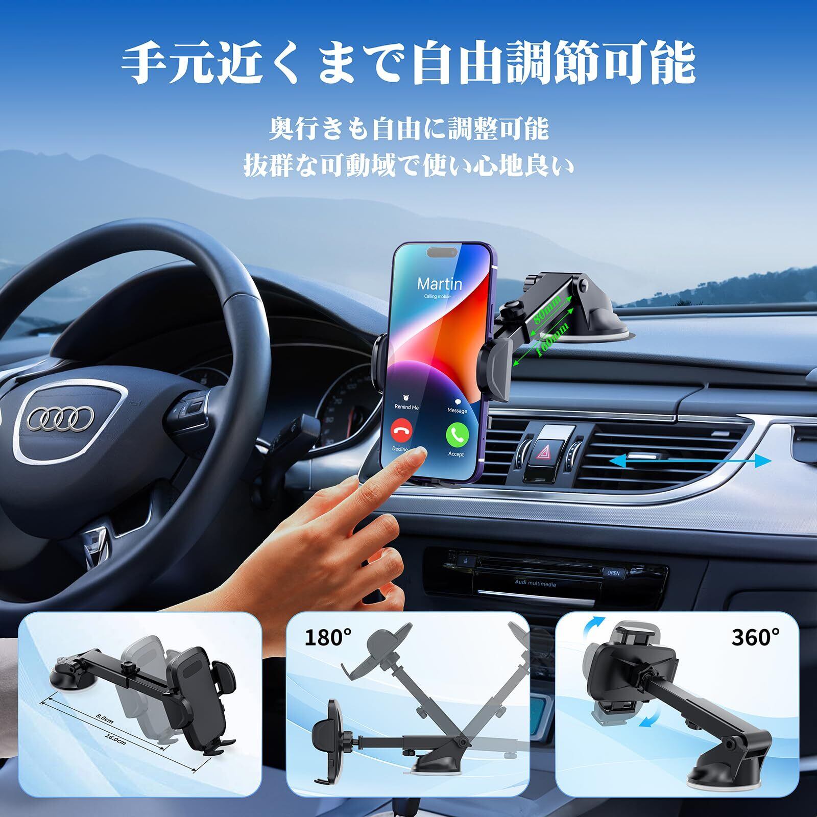 【伸縮ロングアーム&360度自由回転】車 スマホスタンドのアームは8cmから16cmまで伸縮可能で、ダッシュボードから更に離れた位置でも簡単にスマホを操作することが可能です。 スマホホルダー アームの角度が最大270度まで調節可能のデザインや、超強力真空吸盤式ホルダーの構造で操作性が抜群し、使いやすいです。 されに、360度回転できるボールジョイントを採用、縦・横・上下・左右など角度を調節できます。超広範囲の可動範囲で、すべての車種に応じできます。 また、下部支えの中央に充電端子を差し込むスペースがあるので、スマホスタンドに置いたまま充電でき、いつでもスマホの電量不足が心配要りません。
