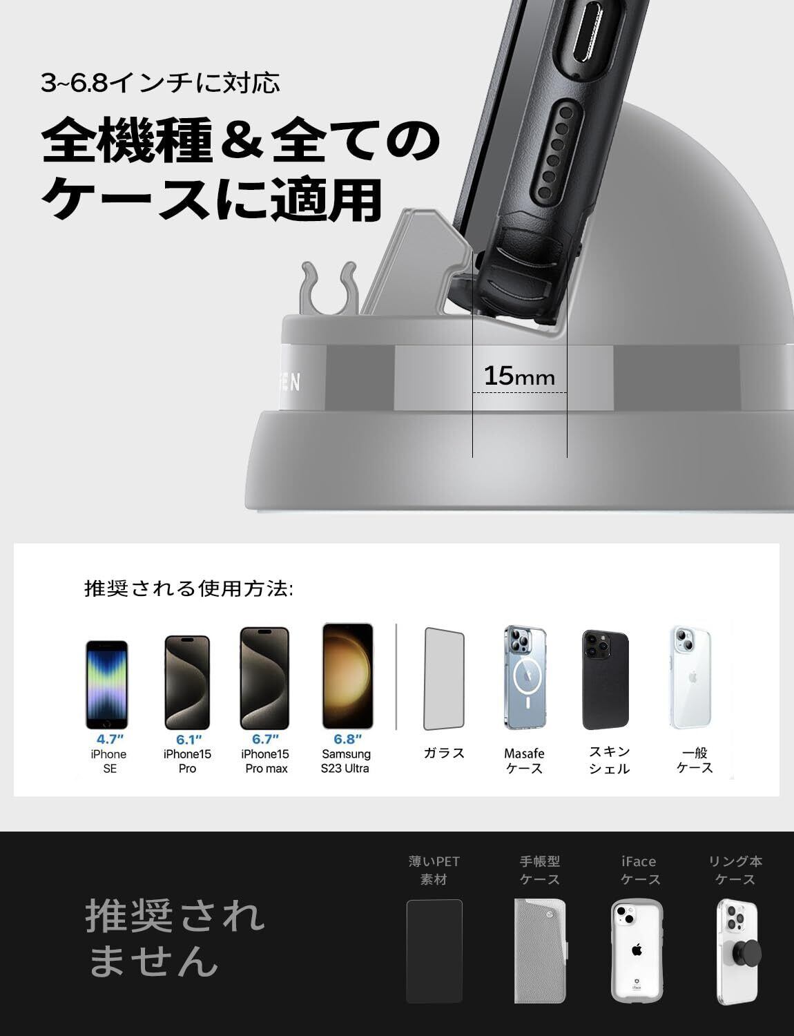 【幅広い対応性】当社のダッシュボードスマートフォンホルダーは、厚さの6〜13ミリメートルのほとんどのスマートフォンやGPSデバイスに対応できます。特に、設計された前向きの充電器スロットは、スマートフォンの背面カメラを遮らず、充電ポートやイヤホンジャックに影響を与えることなく、スマートフォンの機能を完全に利用できるようになっています。具体的には、iPhone 15/15 Plus/15 Pro/15 Pro Max、iPhone 14/14 Plus/14 Pro/14 Pro Max、iPhone 13/13 Mini/13 Pro/13 Pro Max、Samsung Galaxy Note 8/9/10/10 Pro/20 Ultra、S24/23/22/21、Sony、FCNT、SHARPなどに対応できます。しかし、スマートフォンおよび厚さが13ミリメートルを超えるスマートフォンケースを使用しないでくださいスマホ車載ホルダー。