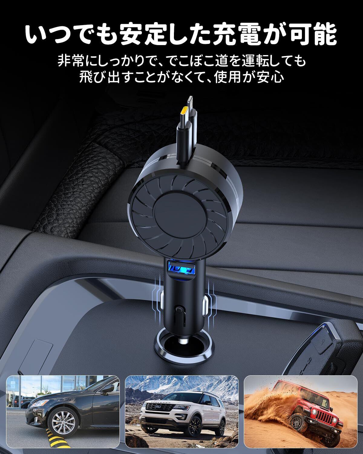 【保管しやすいカーチャージャー】巻き取り式の充電ケーブルで、絡まることなく、車の散らかりにサヨナラ!ケーブルは最長80cmまで簡単に伸ばすことができ、デバイスのリンクがしやすく、前・後座席両方の方とも快適に充電できます。製品サイズは10.9cm*5cmで、よりコンパクトで、より便利です。