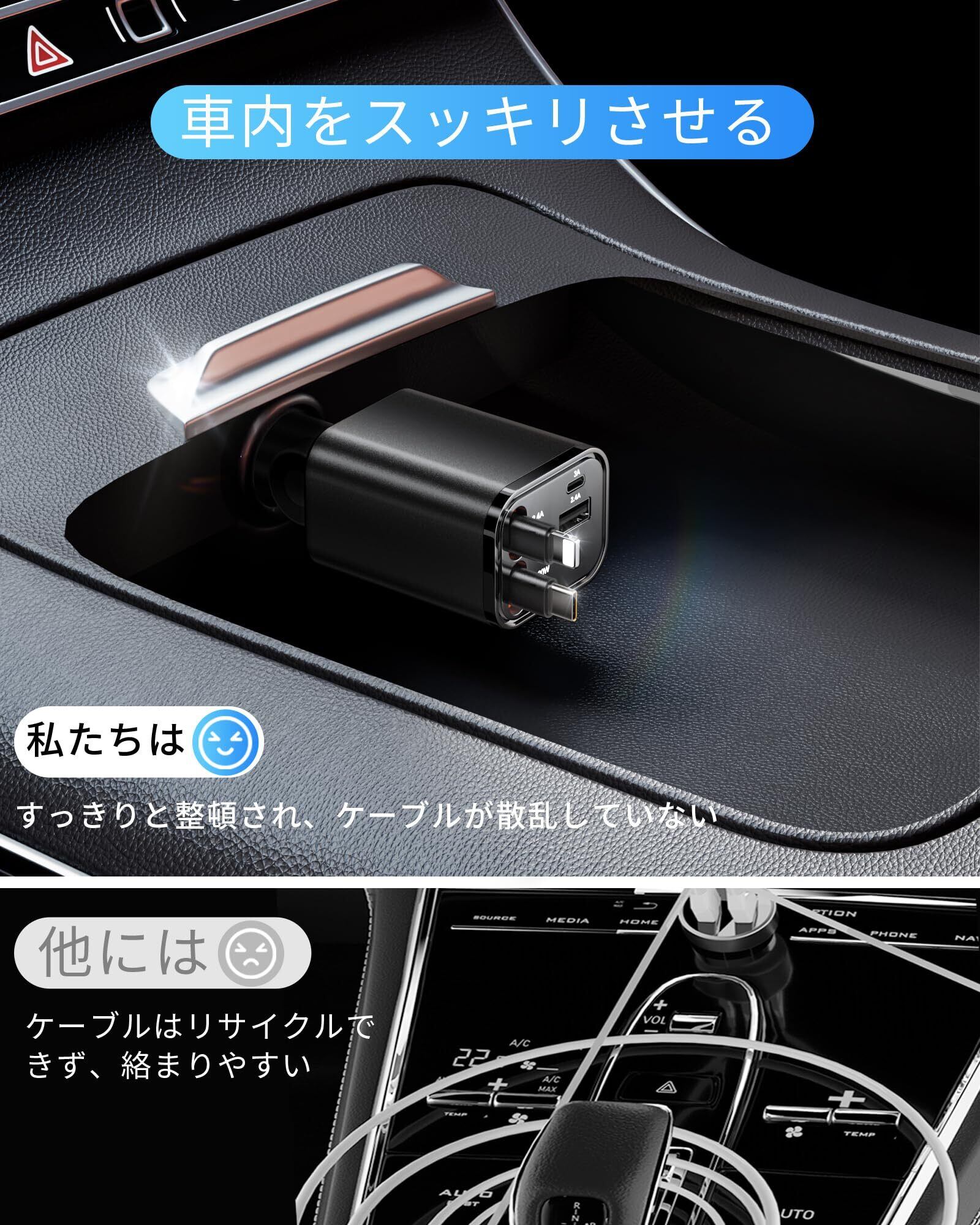 【4台同時に69W急速充電 & PD3.0】このシガーソケット充電器は、ライトニング(12W)とType-C(30W)の2本の巻き取り式充電ケーブルと、USB-Aポート(12W)*1、USB-Cポート(15W)*1の2つの急速充電ポートが付属し、4台のデバイスを同時に充電できます。30W PD Type-Cケーブルは、iPhone 15シリーズの携帯電話の高速充電とサムスンGalaxyシリーズの携帯電話の超高速充電を提供します。ほとんどのAndroidデバイスを35分で0%から88%まで充電できます。