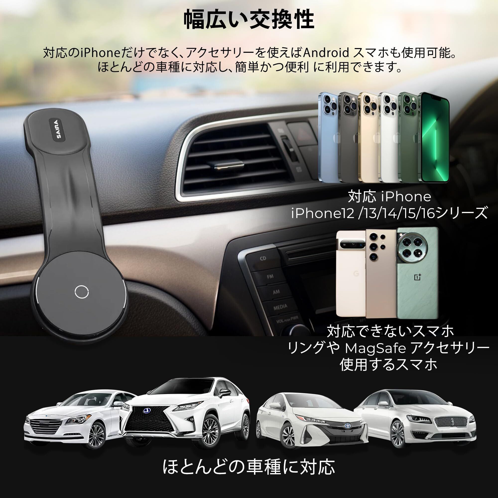 強力な磁力: SAIRA車載スマホホルダーは、52Nグレードの強力な磁石を搭載しており、急カーブや悪路でもスマホをしっかり固定します。magsafe対応デバイスに最適な設計です。