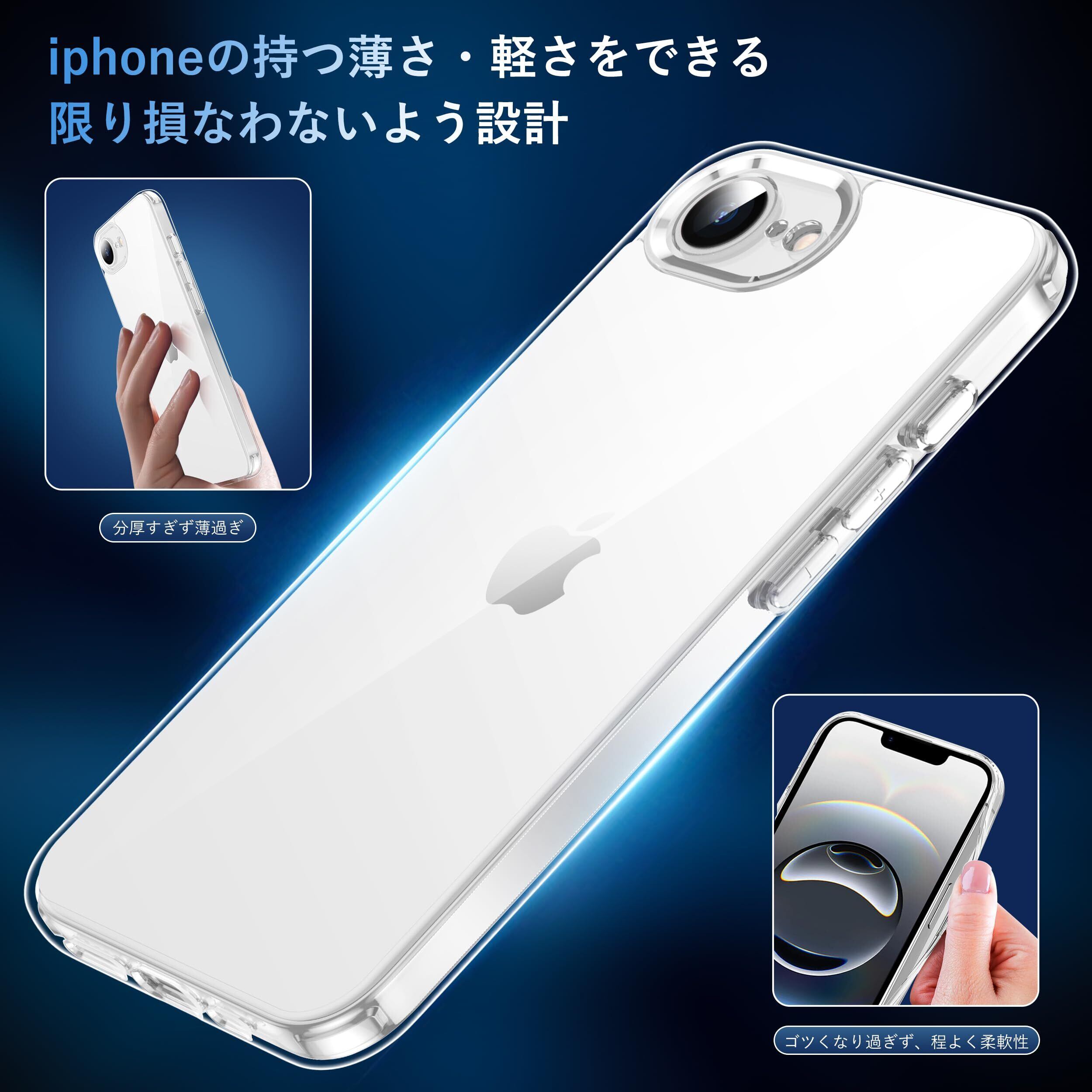 【絶妙バランス・快適操作】クリアケースの保護性能を保ちながら、スマートさを損なわないよう、薄さと強度のバランスを取り、手にフィットする程よい厚みで、快適さが保ち、最適な設計で作り出す。アイフォン16eのボタンやレンズなどの細部に基づいて設計された専用スマホケースは、ぴったりとフィットしています。ボタン、カメラ位置も含めて寸法はバッチリでスマホケースをつけていないかのように快適に使用できます。
