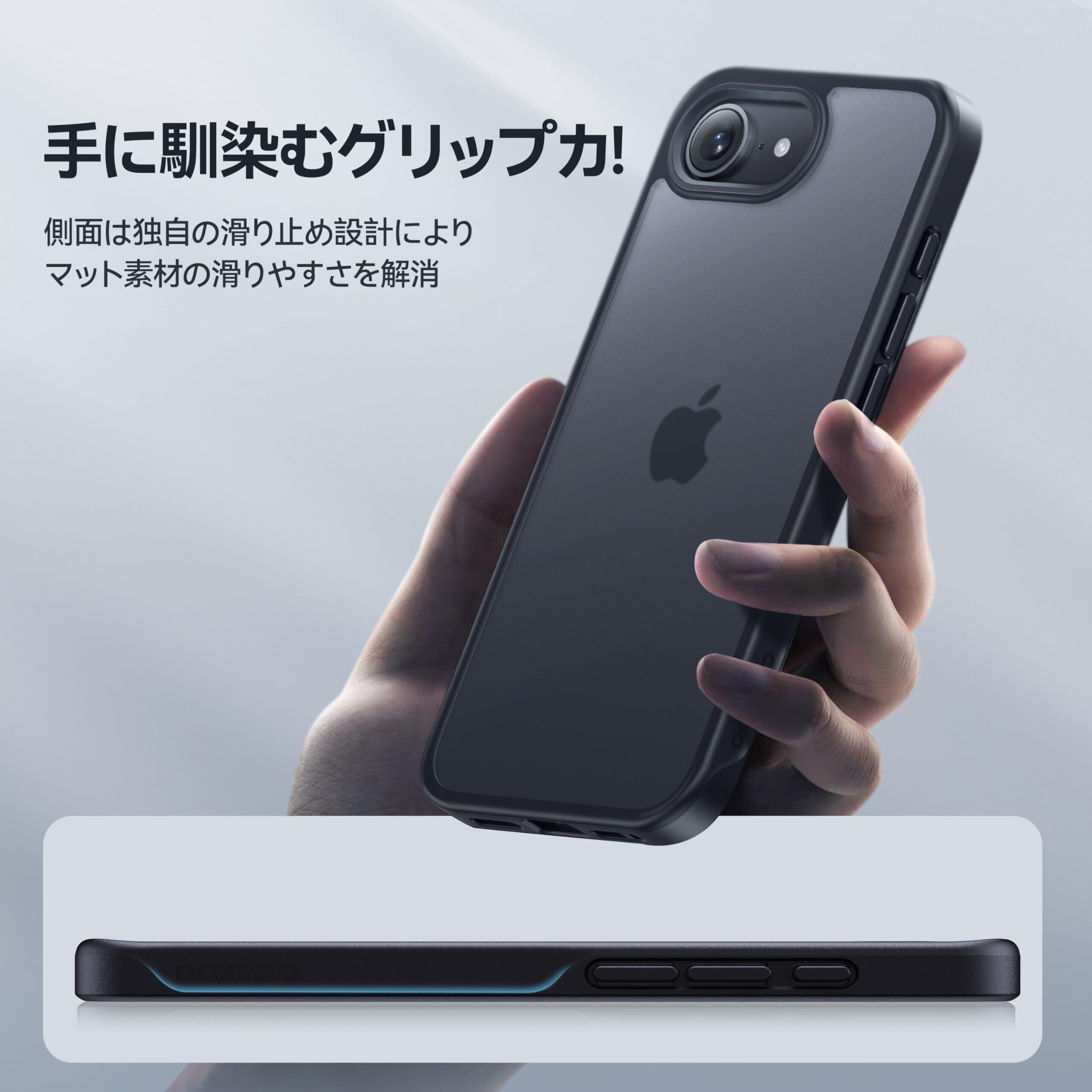 【滑り止め&指紋防止・すごく持ちやすさ】艶消しでマットな質感で手に持った時は背面が滑ることもなくフィットして、サラサラとした触り心地が最高のケース!また、側面の滑り止め設計により、滑りにくさが5倍向上し、持ち心地が従来品より63%改善。手にしっかり馴染み、滑り落ちる心配もない。取得済みの撥油塗装で、5年後でもさっぱりした質感を維持し、指紋の付着問題を完全に解消!マットな質感、触り心地、見た目、どれを取っても優勝!対応機種:iphone 16e ケース