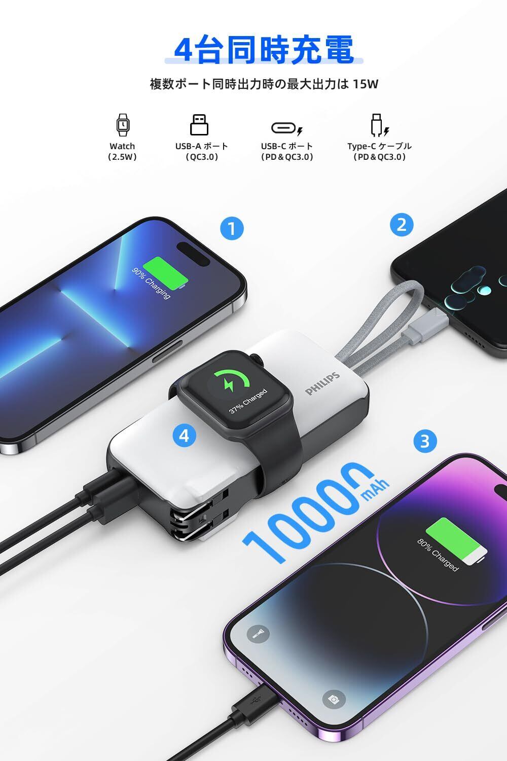 Philips(フィリップス) モバイルバッテリー コンセント一体型 10000mAh Apple Watch対応 アップルウォッチ ACプラグ付き 大容量 携帯充電器 PD 20W出力 4台同時充電 折りたたみ式/USB-Cケーブル内蔵/パススルー機能/ディスプレイ搭載/プラグ変換可能 PSE認証済 ホワイト DLP4350QW