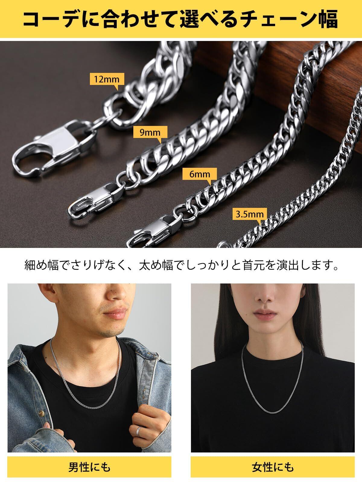 【色も!太さも!長さも選べる!】3.5mm、6mm、9mm、12mmの4太さ、シルバー、ゴールド、ブラックの3色、46cm、51cm、56cm、61cm、66cm、71cm、76cm、91cmの8長さ、全72種類を揃えました!