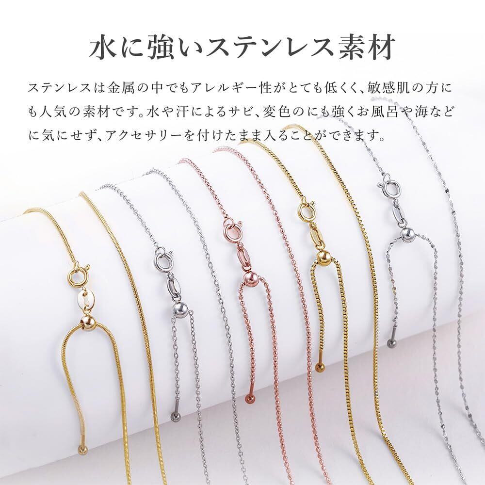 【バリエーション豊富】チェーンの種類がスネークチェーン、あずきチェーン、ボックスチェーン、ボールチェーン、満点星チェーンの5種類、カラーがシルバー、ゴールドの2色の計10種類からお選びいただけますので貴方のお気に入りがきっと見つかります。シンプルに着用したり、お手持ちのチャームなどと合わせてみたりとお好みのスタイルでお楽しみいただけます。 【長さが自由に調節可能なアジャスター付き】 アジャスターで長さを自由に調節可能(30cm、35cm、40cm、45cm)
