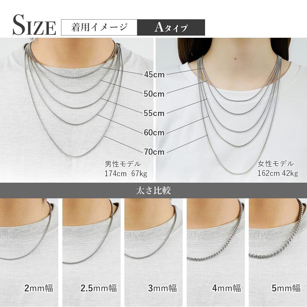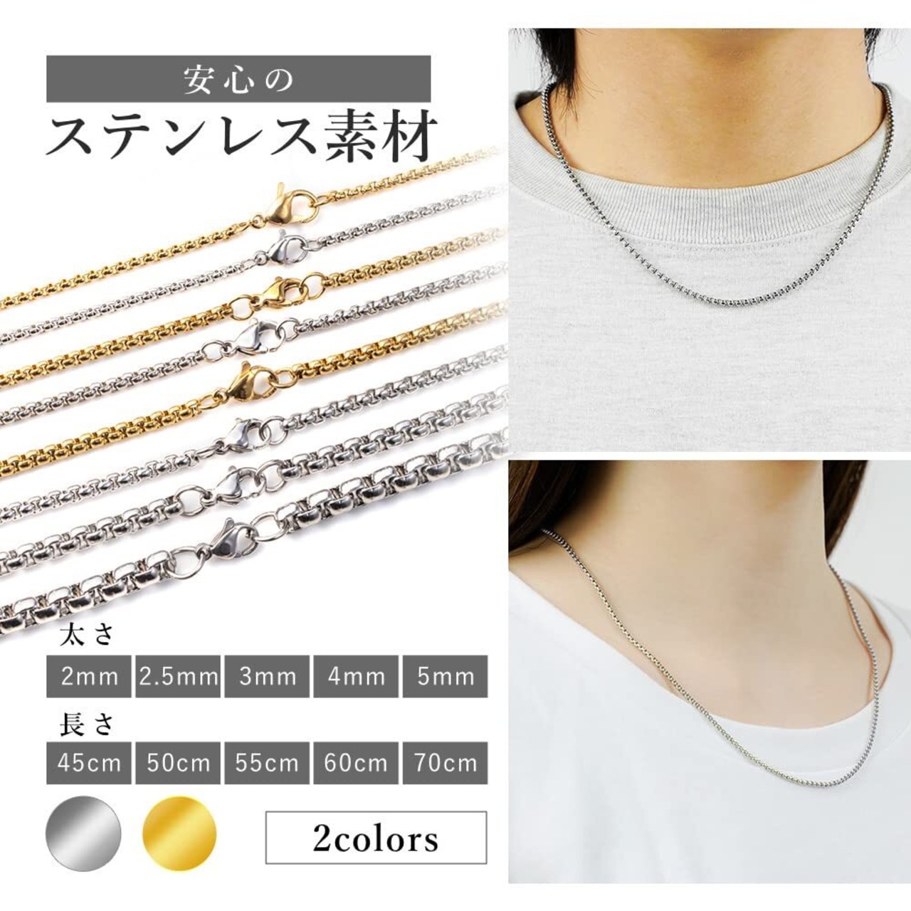 【バリエーション豊富な40種類】 カラーがシルバー、ゴールド、ピンクゴールドの3色。チェーン幅は2mm,3mm,4mm、長さは45cm,50cm,55cm,60cm,70cmまで8種類の計40種類をご用意しておりますのでお好みのカラー、サイズのチェーンが選べます。