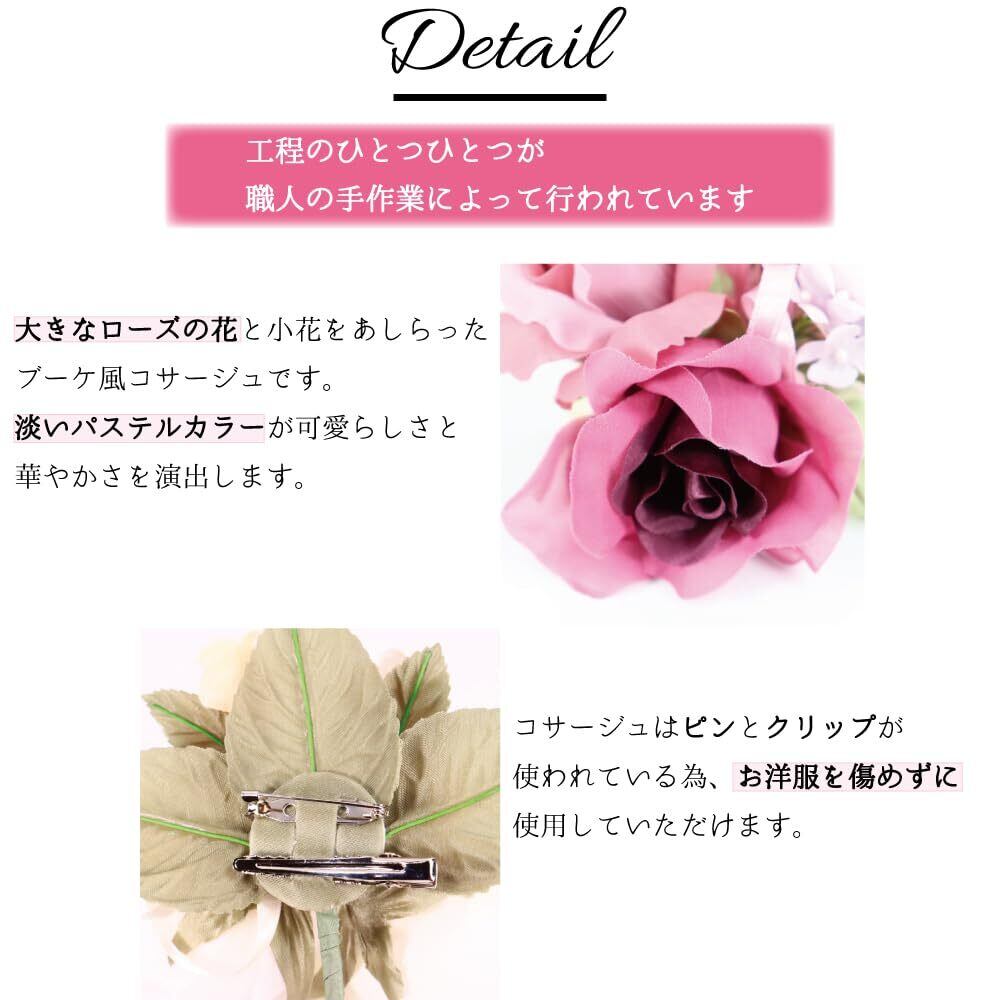 ■バラのブーケをモチーフにしたコサージュです。大きめですが、優しい色合いで華美には見えず、ふんわりと柔和な印象を与えてくれます。 つぼみやサテンリボンもあしらわれており、とても品があります。 カラフルですがパステルカラーなので、華美にならず、胸元を鮮やかに彩ります。
