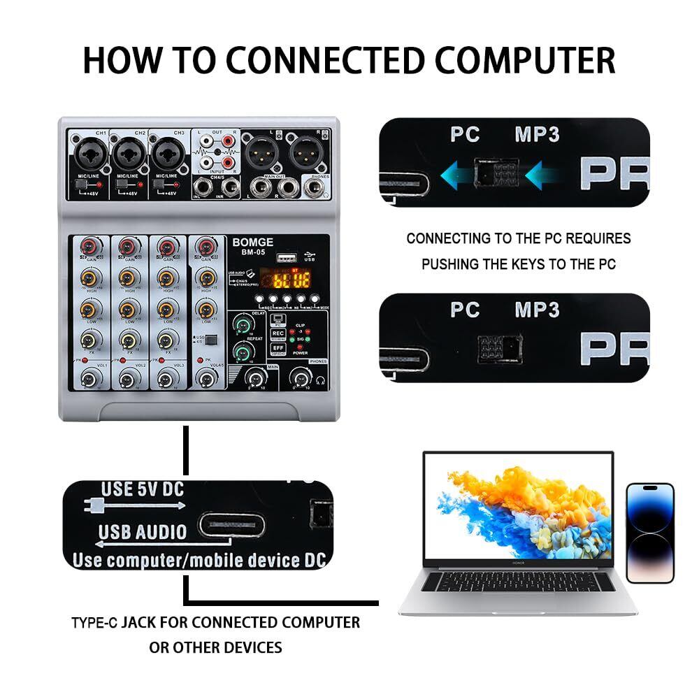 BOMGE オーディオミキサー、5チャンネルデジタルUSB Bluetoothエコーディレイエフェクト付きサウンドボードミキシングコンソール、48Vファンタム電源ステレオDJミキサー、レコーディング、ライブストリーミング、ポッドキャスティング用