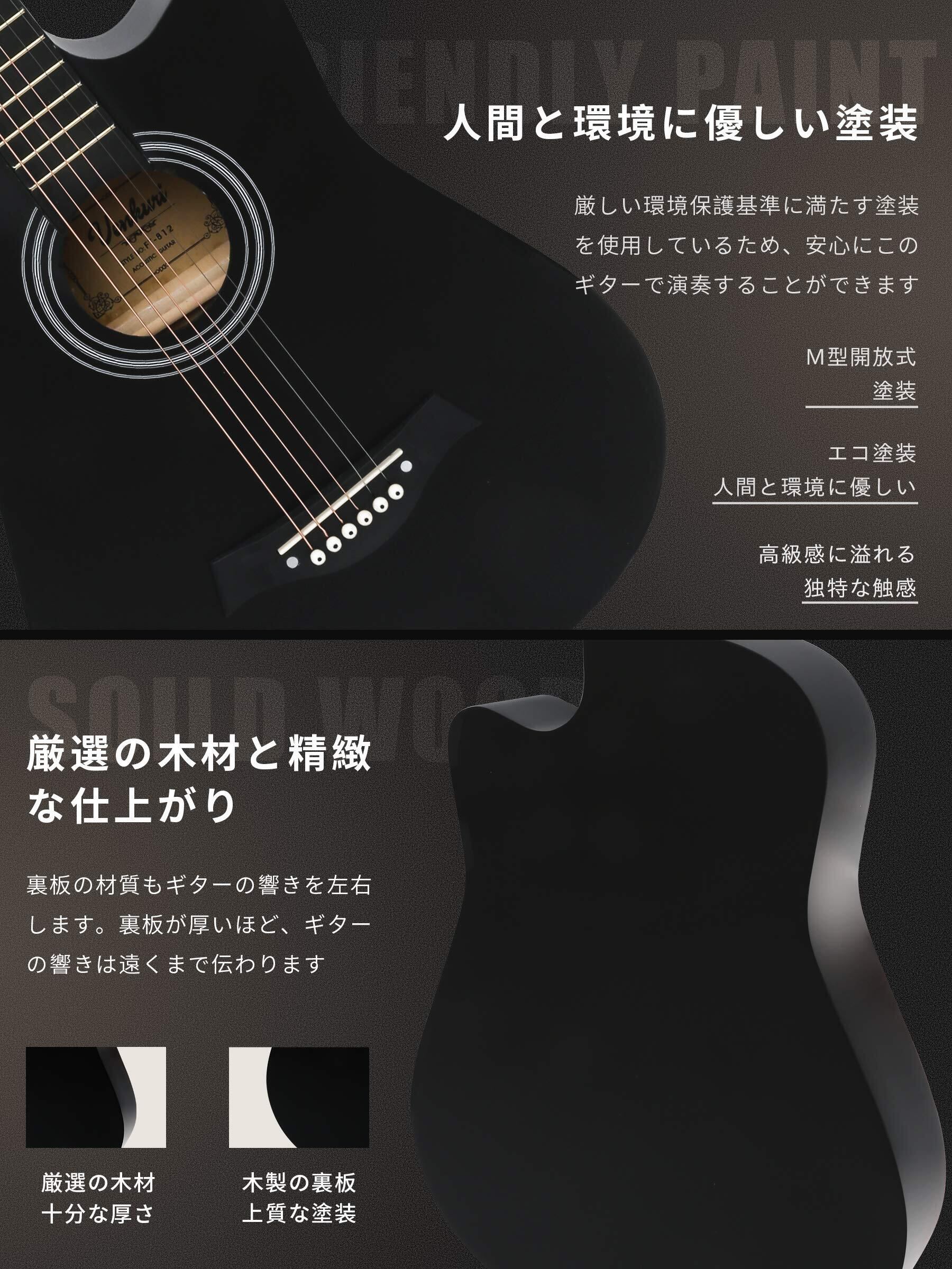 「仕上げとデザイン」アコースティックギターは職人の手で仕上げられ、初心者向けに調整された構造。上質な木材を使い、湿気処理と真空乾燥を施した高品質ギター。