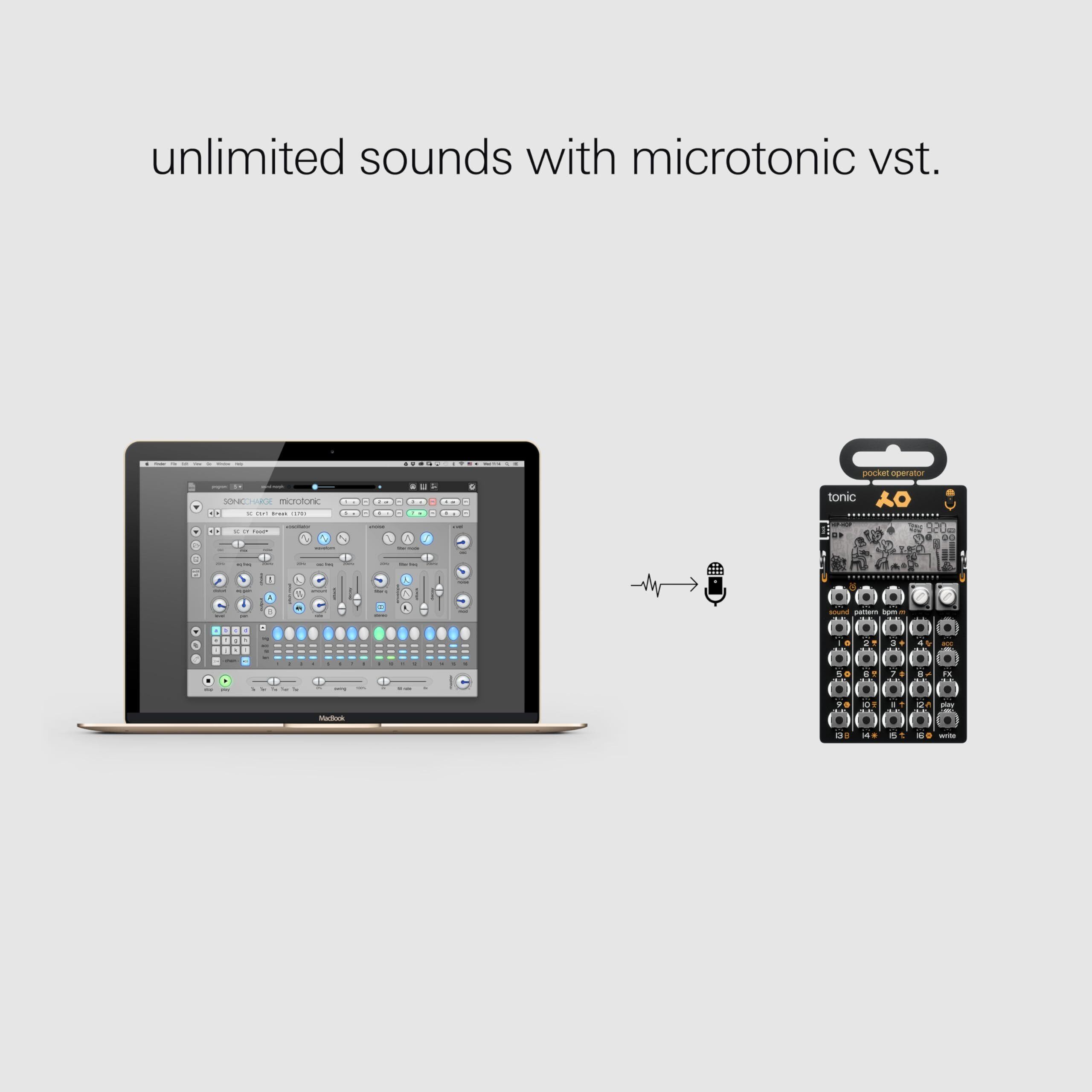 PO-32は、音色数の制限を取り払った初のpocket operatoモデルです。16個のプリセット・サウンドに加え、Sonic ChargeのMicrotonicを使って独自のサウンドを作り、PO-32に搭載された内蔵マイクでワイアレスに、またはミニプラグケーブルで接続して転送することができます。