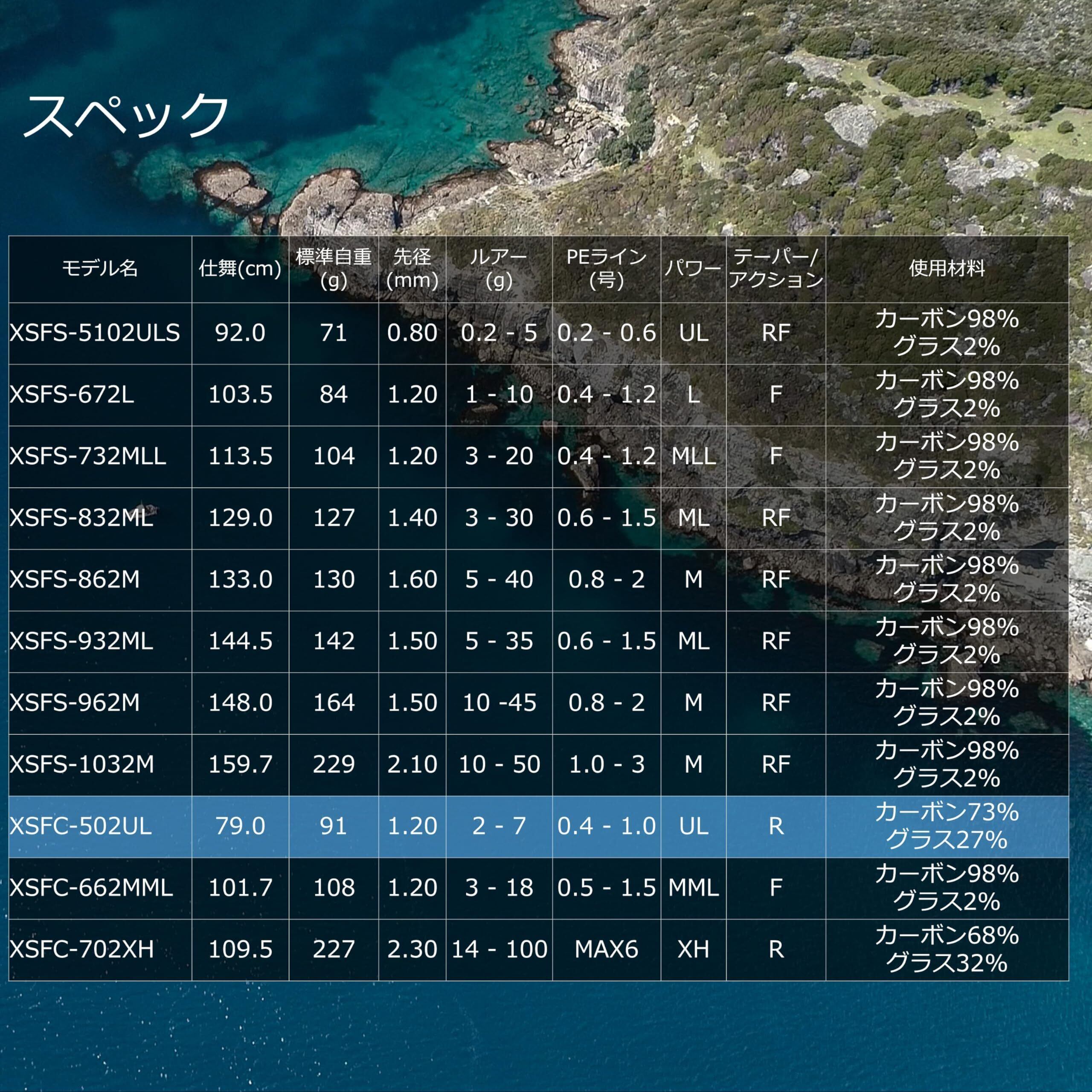 全長(ft/cm)5'0"/152.5●仕舞(cm)79●標準自重(g)91●先径(mm)1.2●ルアー(g)2 - 7●フロロカーボンライン(lb)4 - 8●PEライン(号)0.4 - 1.0●パワーUL●テーパー/アクションR●使用材料カーボン73%,グラス27%