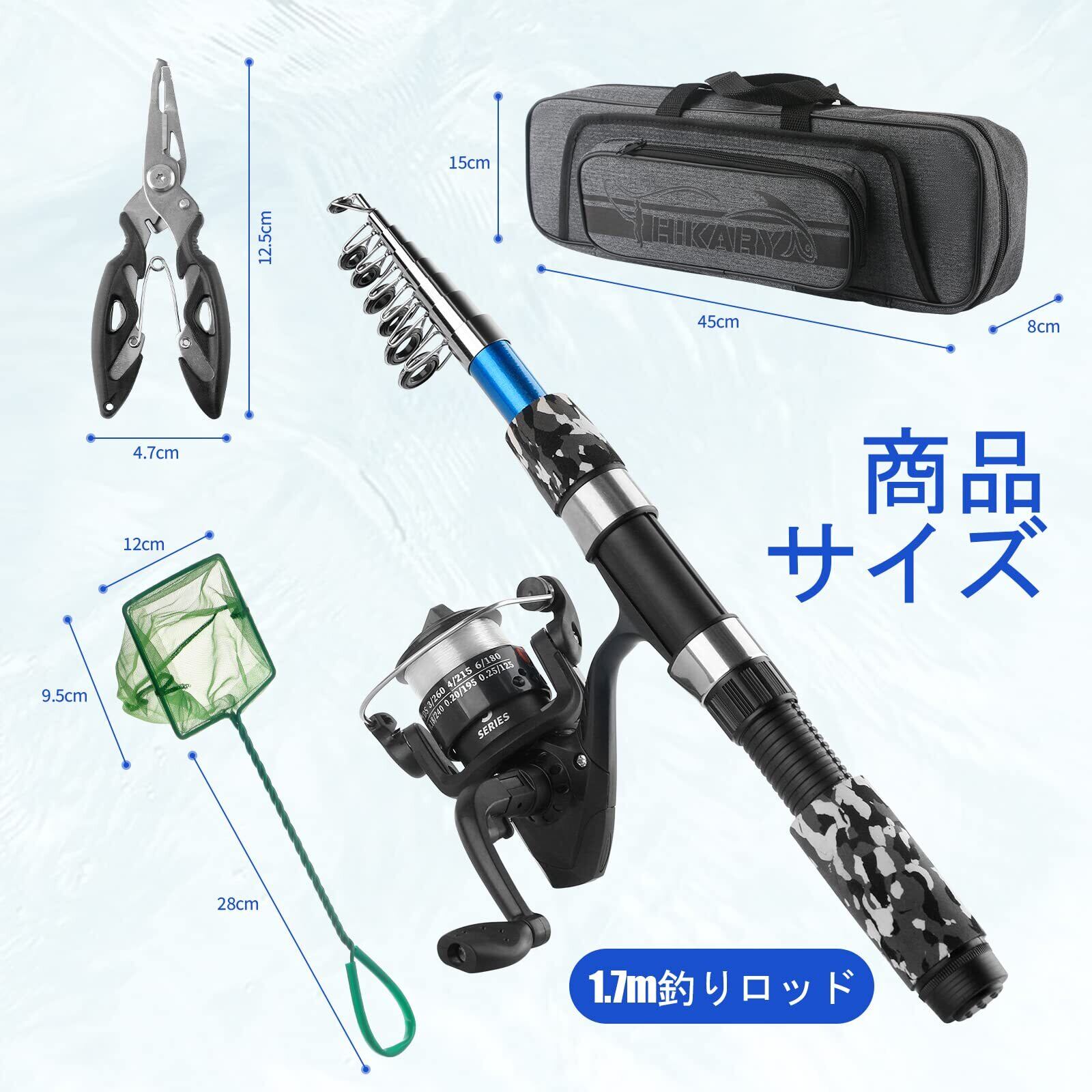【初心者向けの釣りセット】このセットは1.7M釣り竿2本とスピニングリール2個、71点のルアーセット、ミニフィッシングブライヤー2本、ミニ釣りタモ網2個と釣りバッグ1個でできている。 初心者向けに作って、初心者や青少年へのプレゼントに最適です。