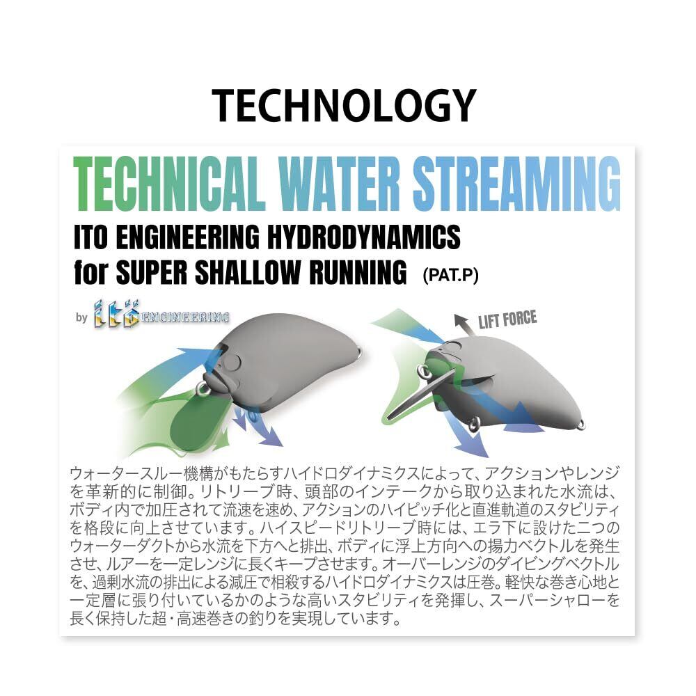 今江克隆と伊東由樹による知見の融合が導く究極解、I×I(アイバイアイ)ブランドが送り出す第三の刺客が、I×I【BLOWLY】です。ブローリーは、フューリアスで確立した伊東のハイドロダイナミクス(PAT.P)を導入。ファットボディがスーパーシャローを驚異的な振動ピッチで攪拌します。それは、リトリーブコース付近に生息するあらゆるタイプのバスを強制的に奮い立たせるような、「ソニックブーム(衝撃波)発生装置」ともいうべきレベルのもの。あらゆるリトリーブ速度域において、往年のバルサ製クランクを凌駕するアクションピッチを生み出すI×I【BLOWLY】は、「全面投影面積を拡大させる特異なボディフォーマット」×「稀代のウォータースルー構造」による、2つの機能的エレメントの融合が織りなす殊勝なクランキング・パフォーマンスを発揮。泳ぐレンジはスーパーシャローですが、オープンウォーターでは遥か下層のディープレンジから、或いは、やや離れたサイドアングルからも果敢にチェイシングバイトが多発。縦横無尽から突如ターゲットが襲い掛かる、まったく気が抜けないゲームを展開します。