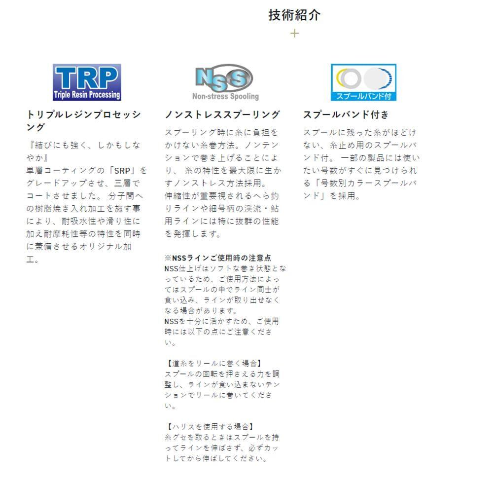 機能:「TRP (トリプルレジンプロセッシング) 三層コート」「NSS (ノンストレススプーリング) ソフトな巻き状態」「スプールバンド付き」