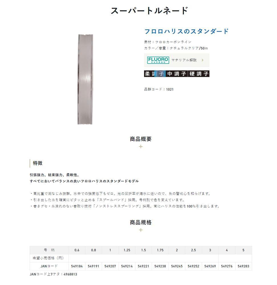 コンセプト: "ザ・スタンダードフロロハリス!" 「柔軟性」を求める声に応え、「しなやかさ」「柔らかさ」に磨きをかけた新生スーパートルネード。原糸の見直しによる柔軟性向上を達成しつつも前作と同じ感覚でお求めできます。