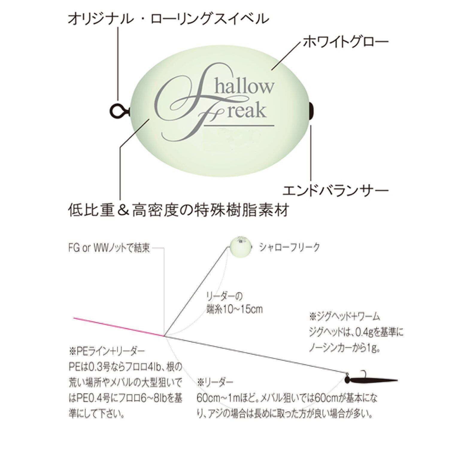 シャローエリアを広範囲に探りたい・・・。さらに遠くのポイントを攻略する為の飛距離が欲しい・・・。超軽量ジグヘッドの動きをストレスなく自然に演出したい・・・。そんなアングラーの要求を満たしてくれるのがFシステムであり、その専用設計フロートが「シャローフリーク」です!!