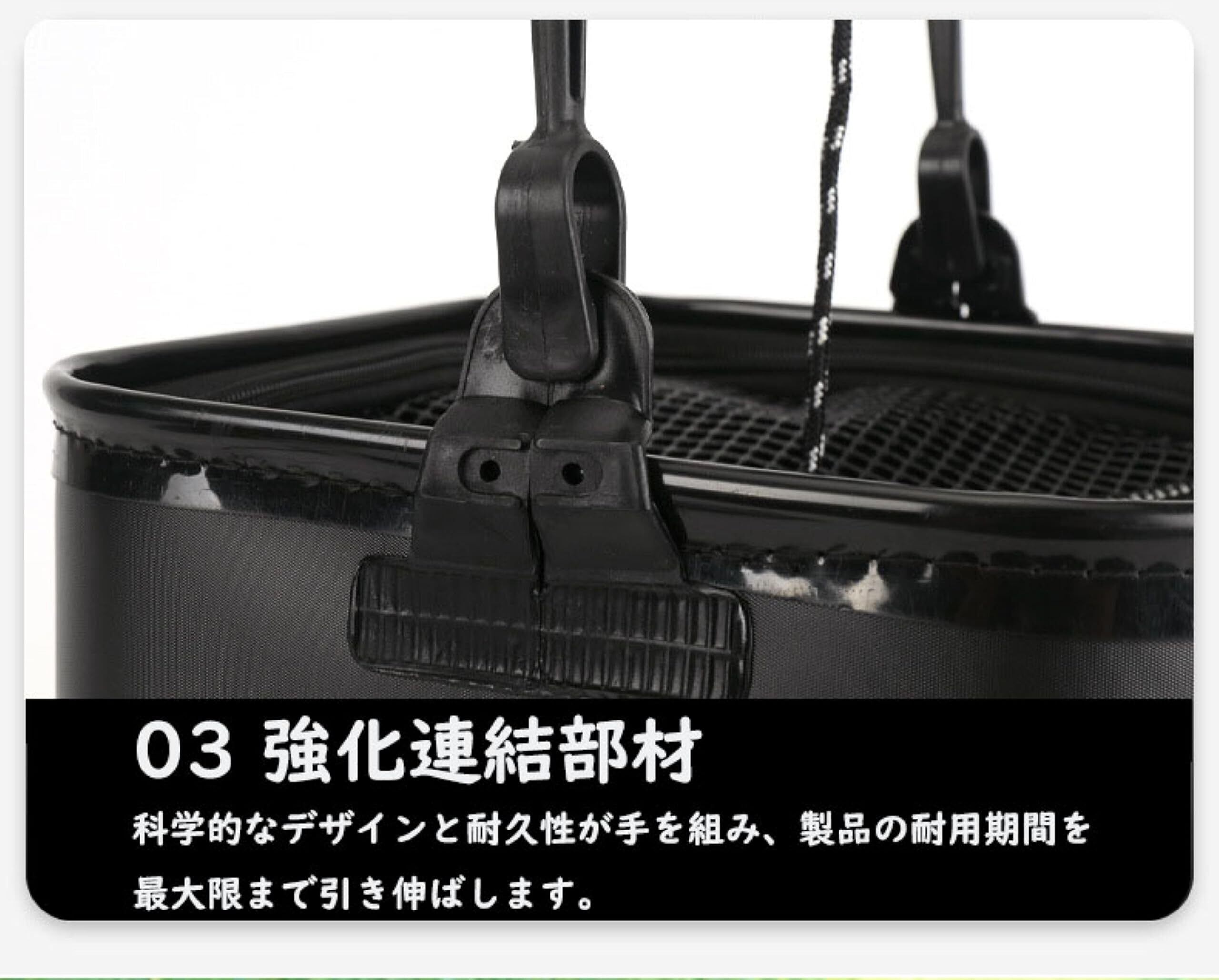 【コンパクト収納のための簡単折りたたみ】耐久性と柔軟性に優れたEVA素材を使用し、一般的な水くみバケツのように「硬すぎて折りたたむのが大変」という問題はありません。折りたたむと使用時の1/4程度の薄さになり、多くの道具を持ち込んだ釣行でも邪魔になりません。