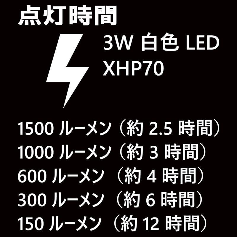 5段階調整(光量: 150ルーメン[連続約12時間]、300ルーメン[連続約6時間]、600ルーメン[連続4時間]、1000ルーメン[連続約3時間]、1500ルーメン[連続約2.5時間]) / LED 白色(一点集中スポットライト)