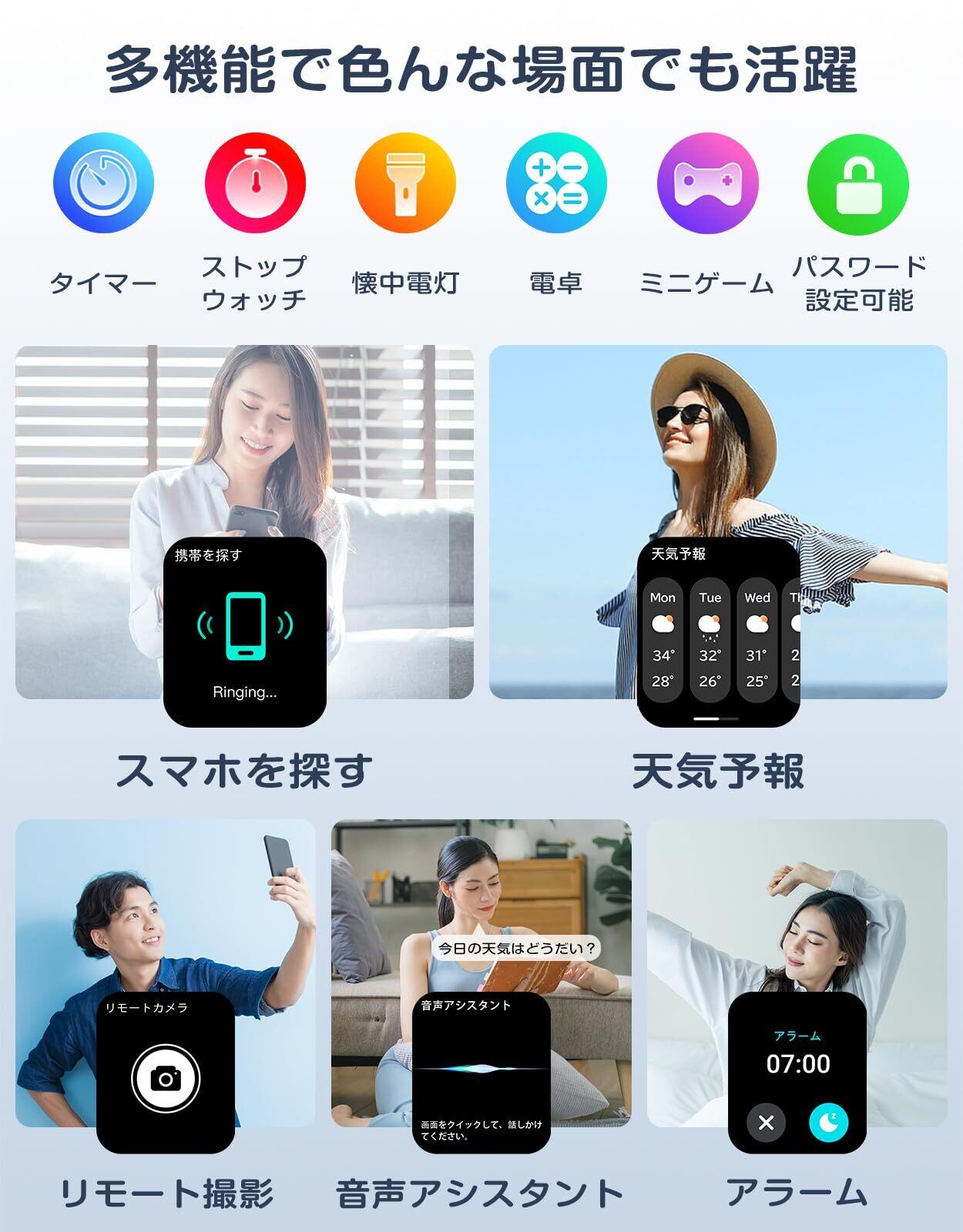 【300+文字盤&多機能ウォッチ】 専用アプリには300種類以上の文字盤が用意しており、男女問わず自由に選ぶことができます。 また、スマホの写真を文字盤に設定することも可能です。服装や気分に合わせて文字盤を変えましょう!上記のほか、スマートウォッチには天気予報、音声アシスタント、アラーム、ミニゲーム、パスワード設定可能、タイマー、ストップウォッチ、スマホを探す、懐中電灯、リモート撮影、電卓、腕上げ点灯機能、おやすみモードなど、多彩な機能を備えている。 多機能とスタイリッシュでシンプルな外観で、新年、クリスマス、敬老の日、誕生日などのプレゼントにもおすすめです。
