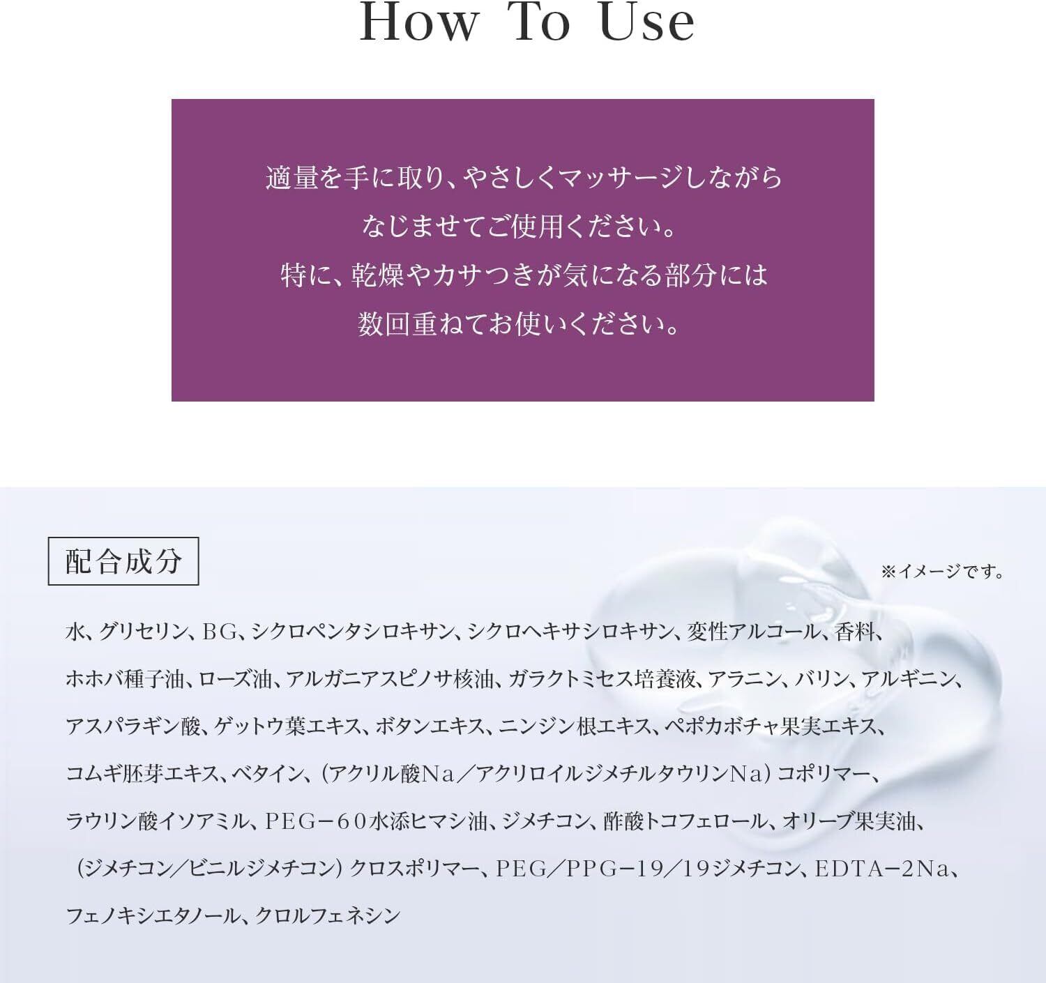 水、グリセリン、BG、シクロペンタシロキサン、シクロヘキサシロキサン、変性アルコール、香料、ホホバ種子油、ローズ油、アルガニアスピノサ核油、ガラクトミセス培養液、アラニン、バリン、アルギニン 、アスパラギン酸、ゲットウ葉エキス、ボタンエキス、ニンジン根エキス、ペポカボチャ果実エキス、コムギ胚芽エキス、ベタイン、(アクリル酸Na/アクリロイルジメチルタウリンNa)コポリマー、ラウリン酸イソアミル 、PEG-60水添ヒマシ油、ジメチコン、酢酸トコフェロール、オリーブ果実油、(ジメチコン/ビニルジメチコン)クロスポリマー、PEG/PPG-19/19ジメチコン、EDTA-2Na、フェノキシエタノール、クロルフェネシン