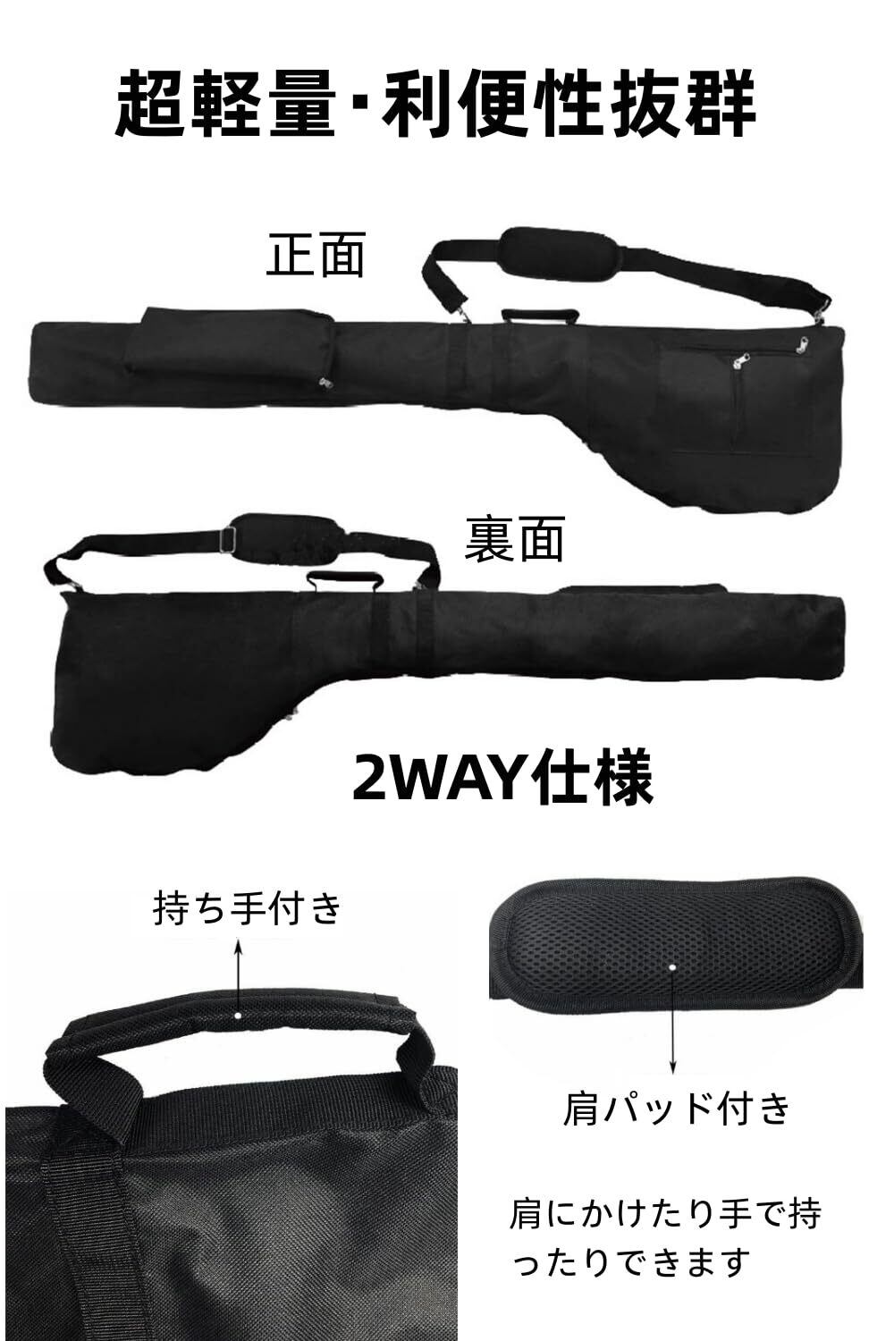 【2WAY仕様】肩にかけたり手で持ったりできます。徒歩や自転車・電車でもラクラク移動ができます。このソフトクラブケース1つで身軽に練習に行けます。重たいキャディーバッグを自宅や練習場から駐車場まで持ち運ぶ必要が無いので、 休日の練習場に気乗りしなかった方や女性の方も気軽に練習に行けます。