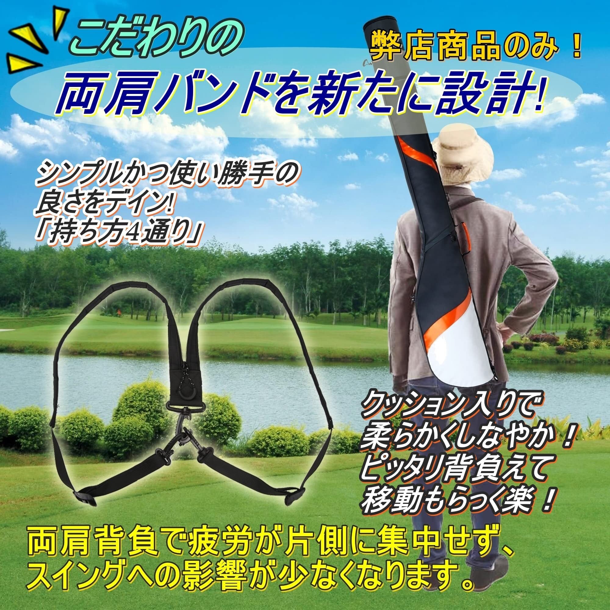 特徴その2. 両肩で背負える! 普通のコースだけではなく、伝統有るコースやショートコースに使い易い。 国内で「予約を取ることが難しい」コースやゴルフ発祥の地、イングランドやスコットランドスタイルはキャディー付の歩行スタイル がメイン。 そんな時に両肩で背負えるゴルフクラブケースは、疲労の蓄積が遅れ、終盤のスコアの違いになるでしょう。 両肩背負時は、グリップを上に向けて下さいます様お願い致します。