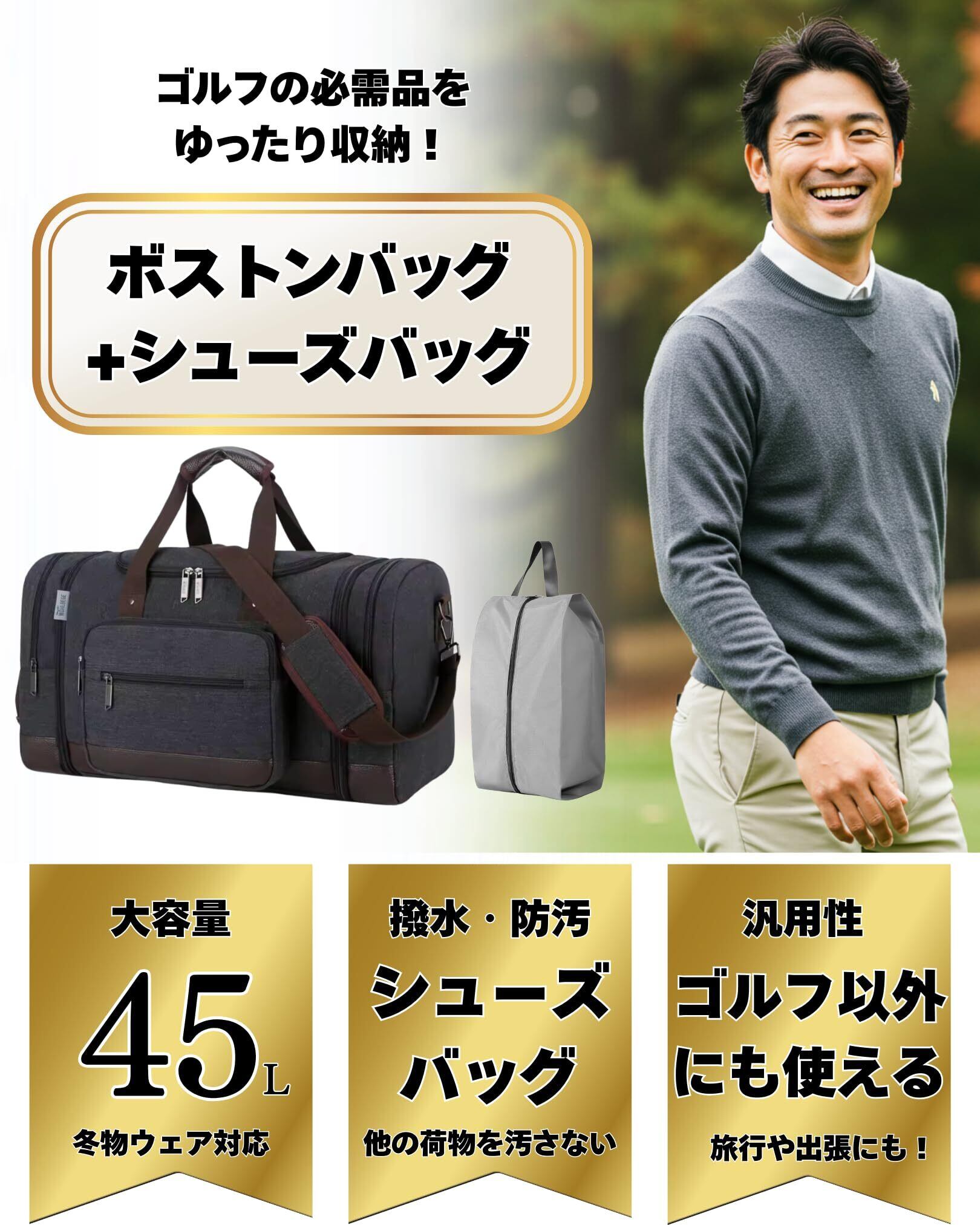 ゴルフ ボストンバッグ メンズ 【 撥水 ・ 防汚 シューズバッグ付き】 × 【 大容量 45L で冬物 ゴルフウェア も収納可能】ショルダーバッグ スポーツバッグ ダッフルバッグ 旅行 出張 フィットネスジム テニス バドミントン 卓球 バスケットボール 野球 サッカー フットサル 多目的 ゴルフバッグ (ブラック)