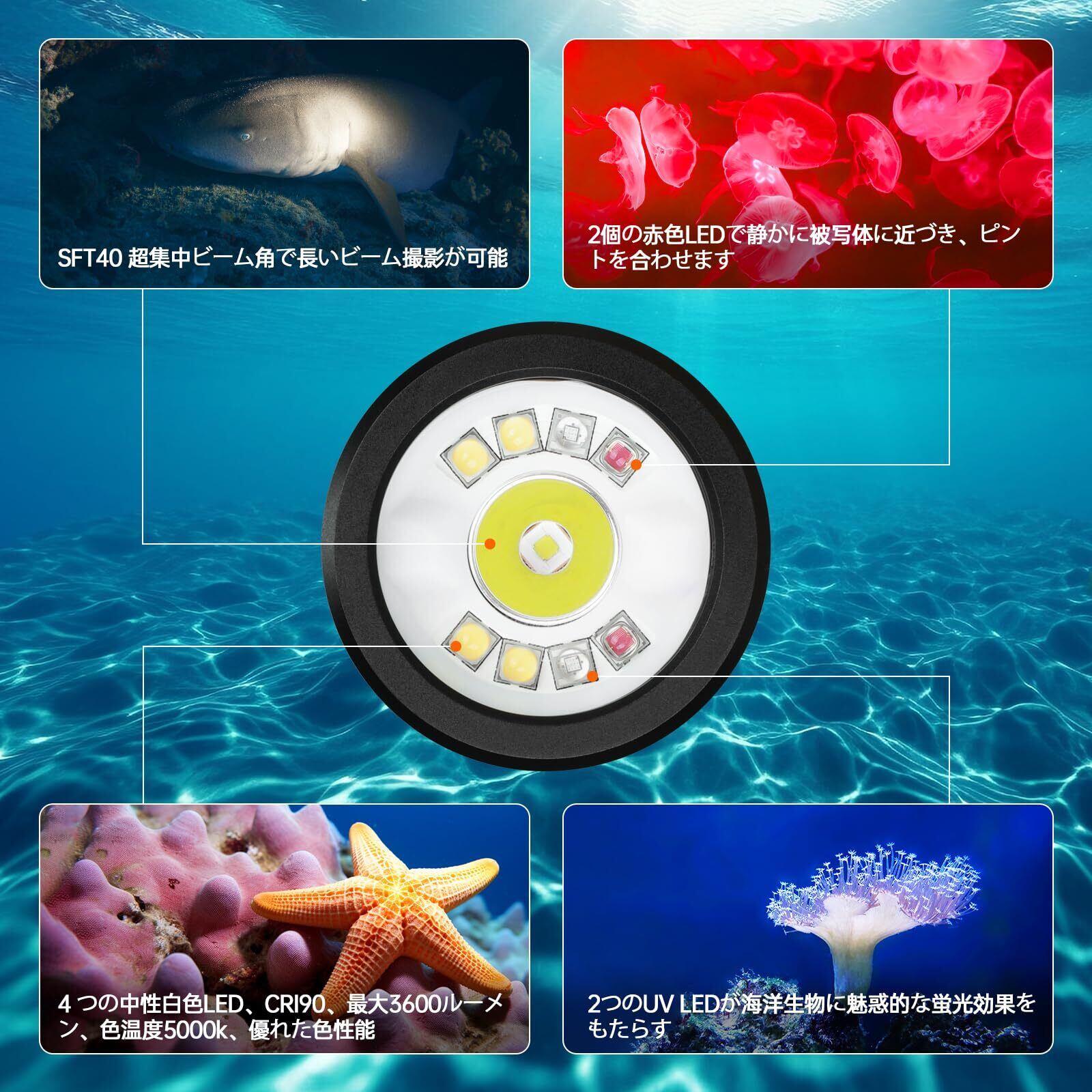 【プロ・超高輝度3600LM・三光源】このダイビングライトは最新の三光源設計で、最大輝度3600ルーメン、最大使用寿命100000時間です。白色光は水質がクリアな場所でのダイビングや日常生活に最適です。赤色光は水中で補助光として使用でき、UVライトは水中の生物観察に役立ちます。