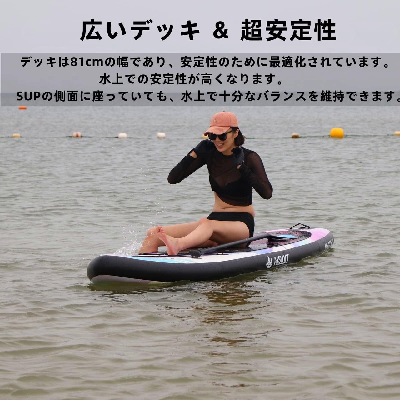 【優れた剛性と安定性】 正確な SUP プレート、美しい性能設計を有し、1平方メートル当たりのトレース密度14400および軍事レベルのPVCレール、15cm厚び81cm幅のSUPは最大の安定性を提供しますが、ボードのスポーティな形状は依然として高速追跡体験を可能にします、完全に膨張したときに15 PSIまでの追加の安定性を提供することができる、初心者でも、AISUNSS SUPインフレータブルパドルボードの上で簡単にバランスを取り、安定させることができます。
