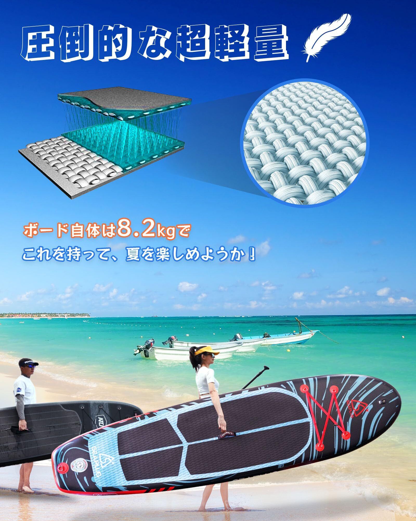 【超耐久性】SEAPLUS サーフボードは高品質PVC + ドロップステッチの材料+ EVA を使用することによって、UV耐性のコーティングとEVAを使用し、耐久性高いのボードになる。サップボードの滑り止めマットは、ダイヤモンドパターンで切断され、滑り止めが強いです。海、川、湖、運河、家族旅行、冒険好き、釣り愛好家、水上ヨギ、遊び方は無限大です。