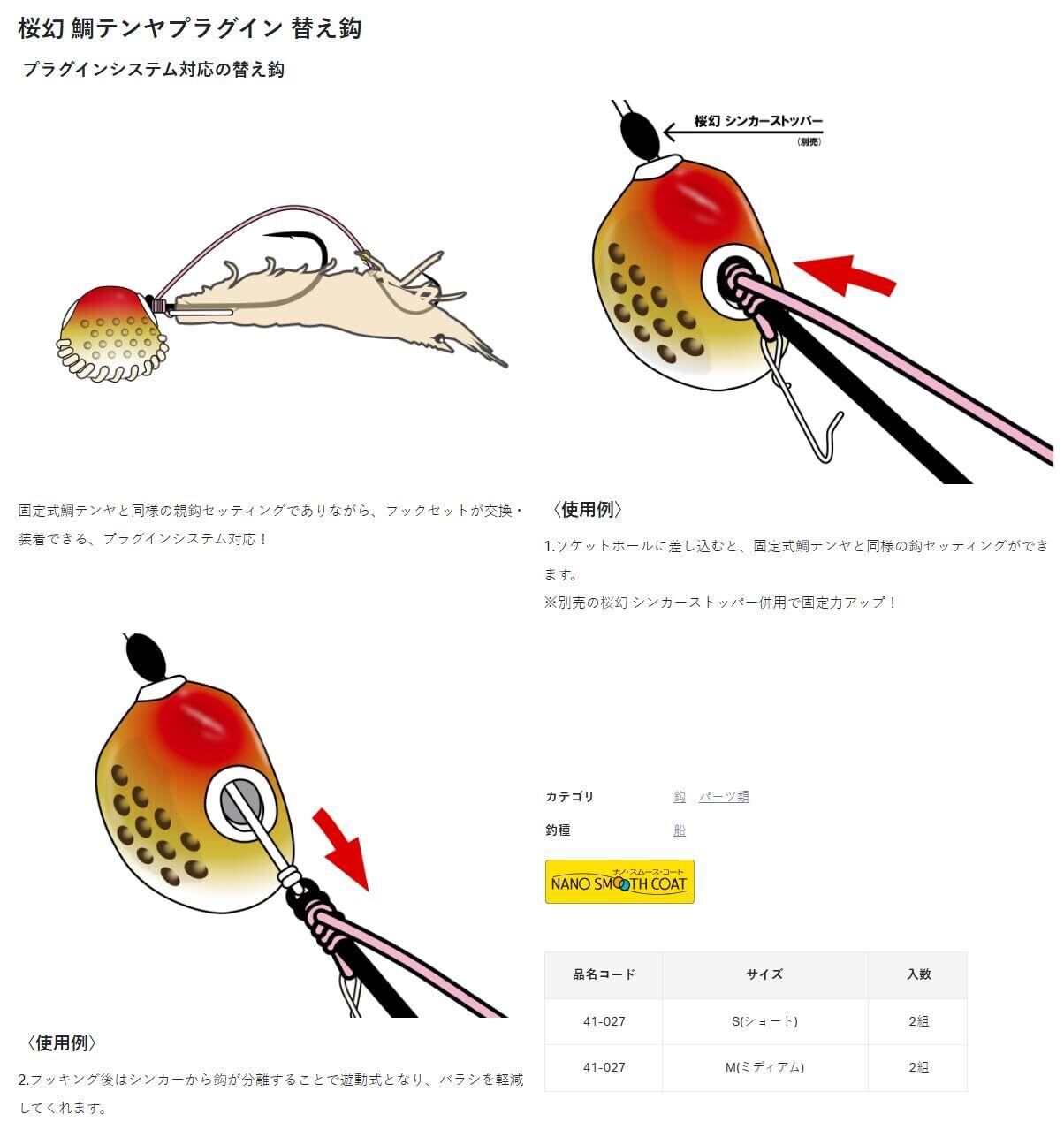 【品目コード: 41-027 / シリーズ名: 桜幻 鯛テンヤプラグイン 替え鈎】……プラグインシステム対応の替え鈎。(※使用例: ソケットホールにプラグインシステム対応の鈎を差し込むと、固定式鯛テンヤと同様の鈎セッティングになり、フッキング後はシンカーから鈎が分離することで遊動式となり、バラシを軽減)