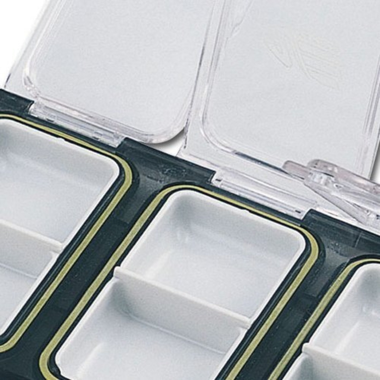 プラスチック製のタックルボックス、ケースなどの企画・設計・製造から品質管理・デリバリーに至るまで長年培ってきた技術・経験・実績を基に、ニーズを的確に捉えた製品創りを続ける明邦化学工業株式会社のフィッシングケース。細かいフックやスナップのサイズ別、タイプ別の収納に最適。付属のサイズ記入用シールとマグネットシールを使うと非常に整理しにくい細かなパーツをストレス無くフィールドでセレクト可能。仕切りトレイ3個付き。サイズ記入用シール付き。フック収納時に便利なマグネットシールも付属。VS8050にピッタリ収納できる。フタが何段階かに開く構造。各フタによって段階が異なる。