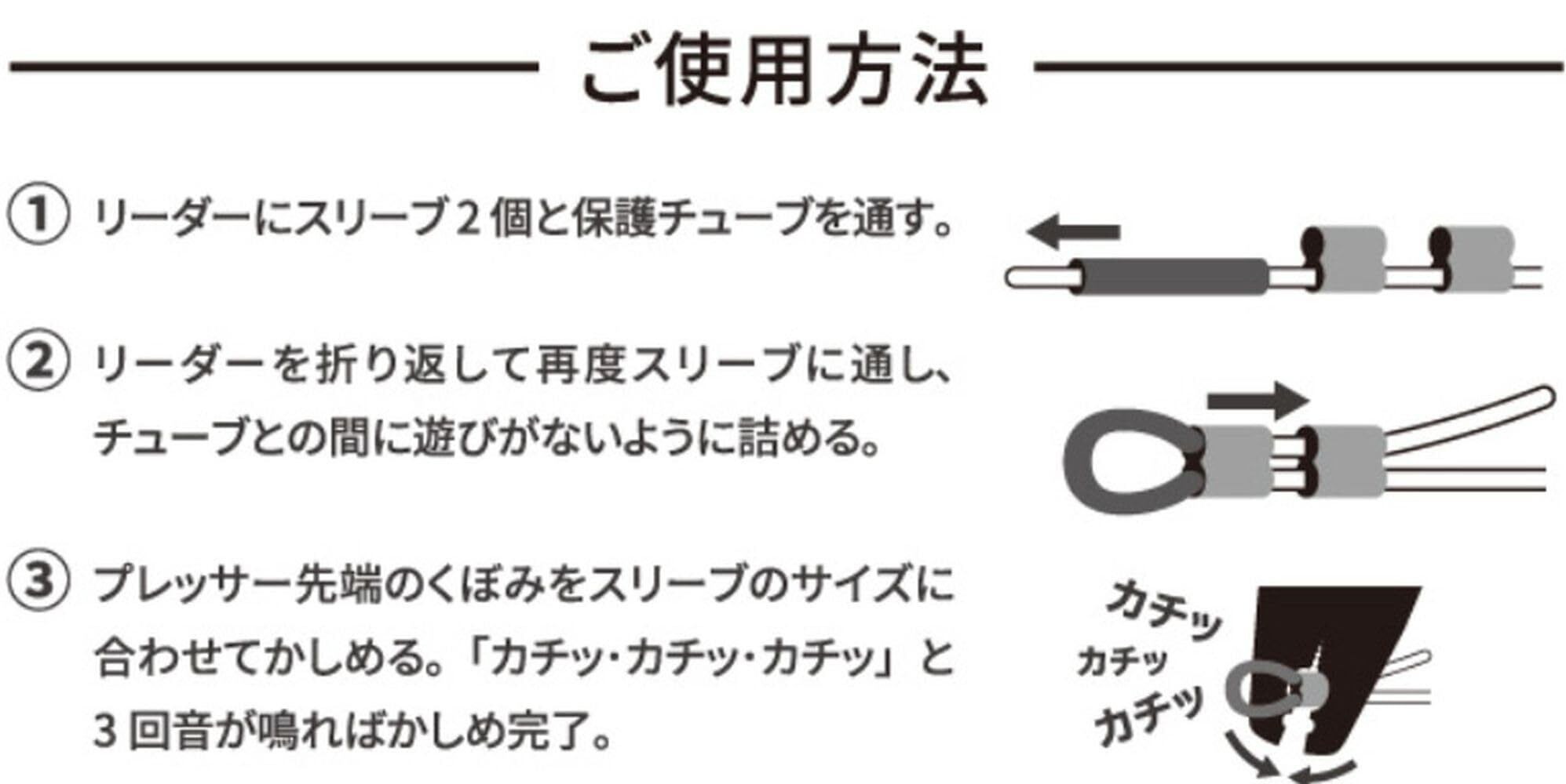 ヤマシタ(YAMASHITA) Maria ファイターズプレッサー ラチェット式×倍力構造 「カチッ・カチッ・カチッ」と音が3回鳴ればかしめ完了!最適な力の伝導で、簡単&確実にスリーブ止めが可能。フックカッター 緊急時にルアーフックも切断できる強力カッター。太軸3/0サイズまでカット可能。防錆処理 防錆処理により海水でも錆びにくい。簡単&確実にスリーブ止め。溝に印字されているサイズに合ったスリーブを選び、かしめてください。適合スリーブ スリーブ2N リーダー/号数20~40号 スリーブ3N リーダー/号数50~80号 ※解除方法①ノブを上へ押し上げると解除できます。 ※解除方法②閉じた状態で強く握りこむとハンドルを解除できます。ご使用方法①リーダーにスリーブ2個と保護チューブを通す。②リーダーを折り返して再度スリーブに通し、チューブとの間に遊びがないように詰める。③プレッサー先端のくぼみをスリーブのサイズに合わせてかしめる。「カチッ・カチッ・カチッ」と3回音が鳴ればかしめ完了。