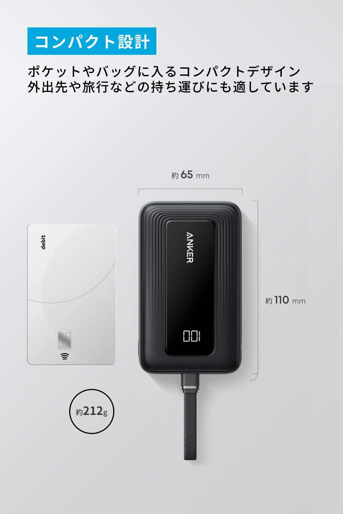 ケーブル一体型で、荷物がスッキリ:USB-Cケーブル一体型のため、外出先でもお使いの機器をいつでも充電可能です。約14cmの一体型ケーブルは約10,000回の折り曲げにも耐えられる優れた耐久性を実現しました。(Anker調べ)