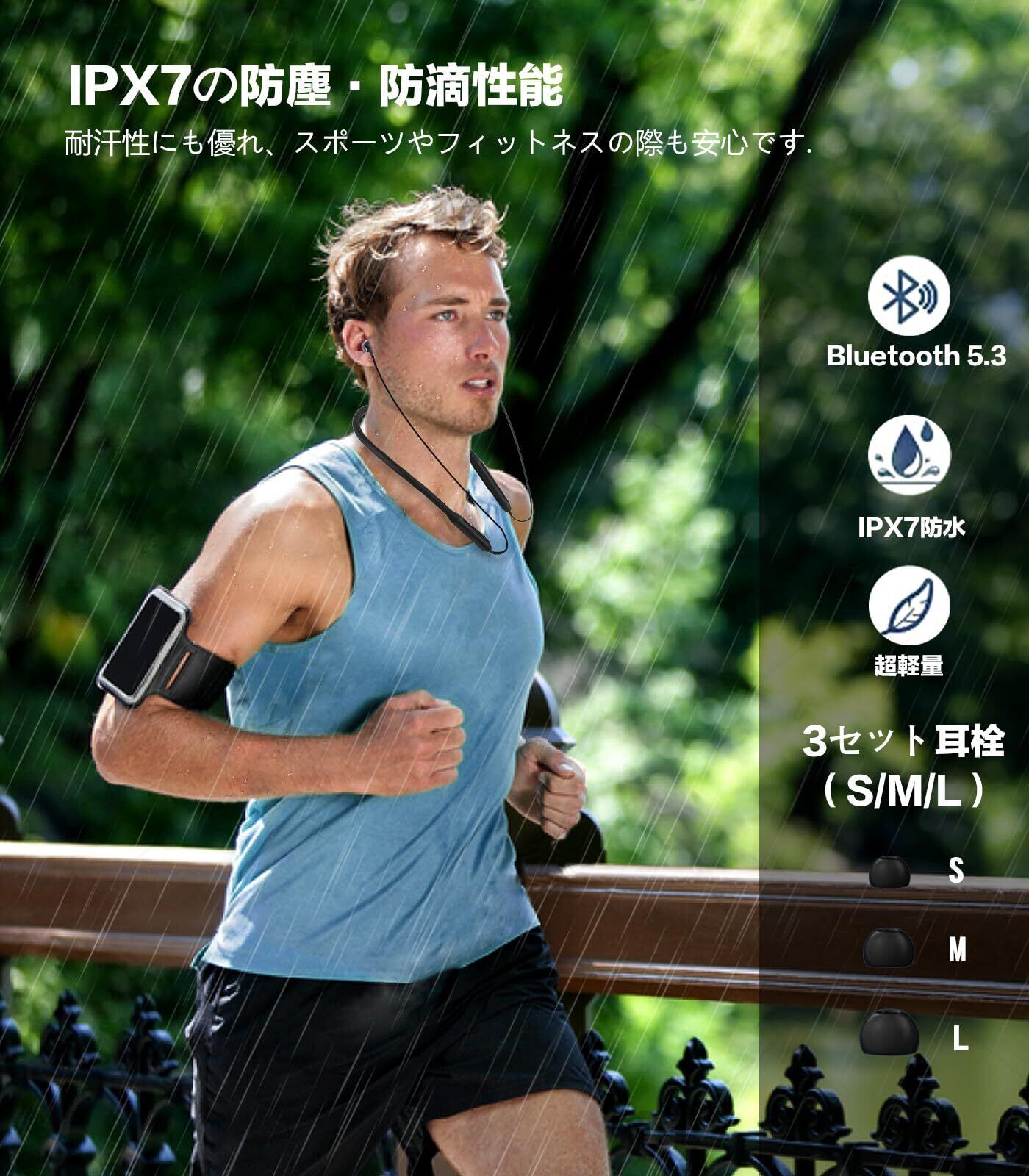 【軽量設計&IPX7防水】ネックバンド型 イヤホンはわずか30gの重さで、耳に圧力を感じることなく長時間装着しても疲れを感じません。またIPX7防水性能を備えて、汗や水しぶきに強い、突然の雨や、激しい運動の汗で濡れてもBluetooth イヤホンを安心して使えます。ジョギング、ランニング、ヨガ、スポーツ、ジム、サイクリングなどに適用します。