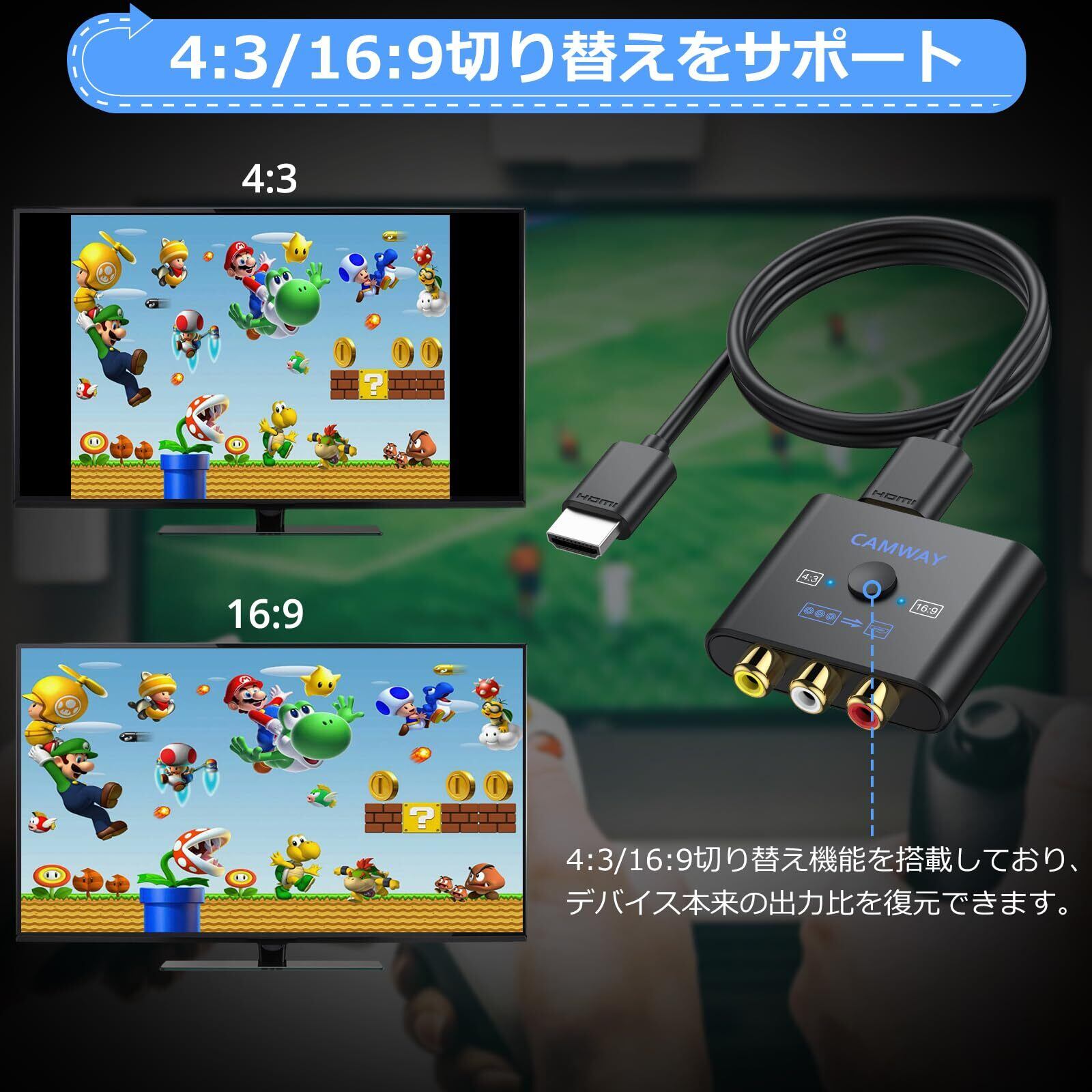 CAMWAY RCA to HDMI 変換 コンバーター 16:9/4:3変換 AV to HDMI コンバーター hdmi 変換 720P/1080P変換 (赤、白、黄)3色端子 ミニ コンポジット Wii/PS1/PS2/N64用 DVD/VHS/VCR用