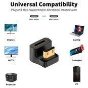 8K Ultra HDビデオ: U字型ミニHDMIアダプタは、標準バージョン2.1である最大48Gbpsの帯域幅伝送をサポートします。高解像度ビデオとマルチチャンネルデジタルオーディオを1つのアダプタに統合することができ、様々なホームシアターニーズを満たし、スムーズでクリアな体験を提供します。