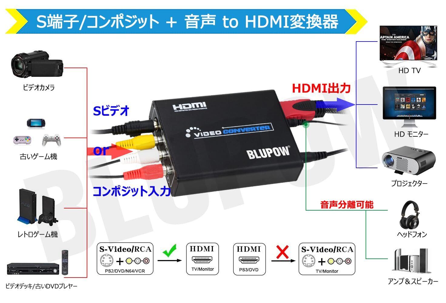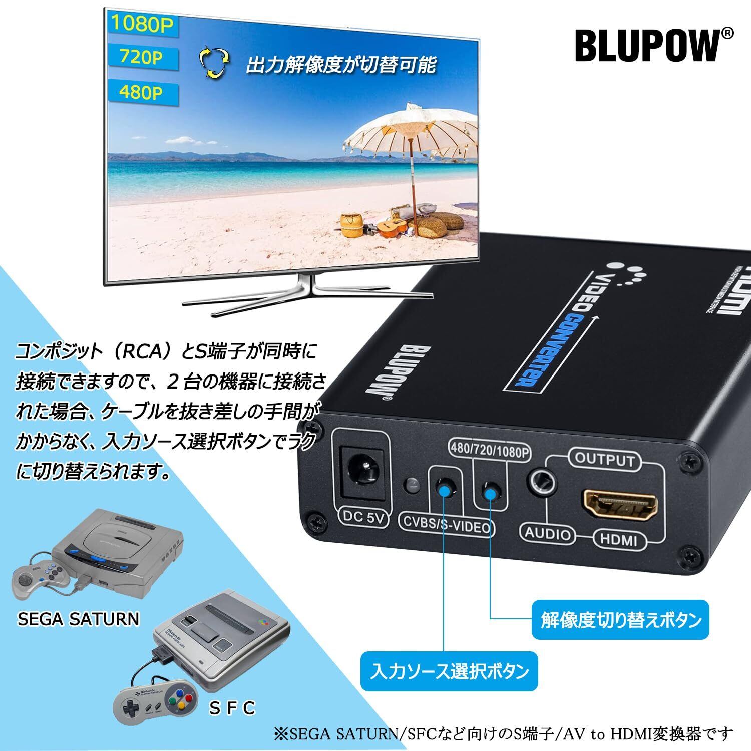 BLUPOW コンポジット/S端子 to HDMI 変換器 1080P対応 Composite 3RCA AV/S-Video to HDコンバーター Sビデオ/3色端子をhdmiに変換 アナログ デジタル 変換機 rca to hdmi レトロゲーム機(セガサターン/SFC/N64/PS2など)向けの変換器 日本語マニュアル付き VA504