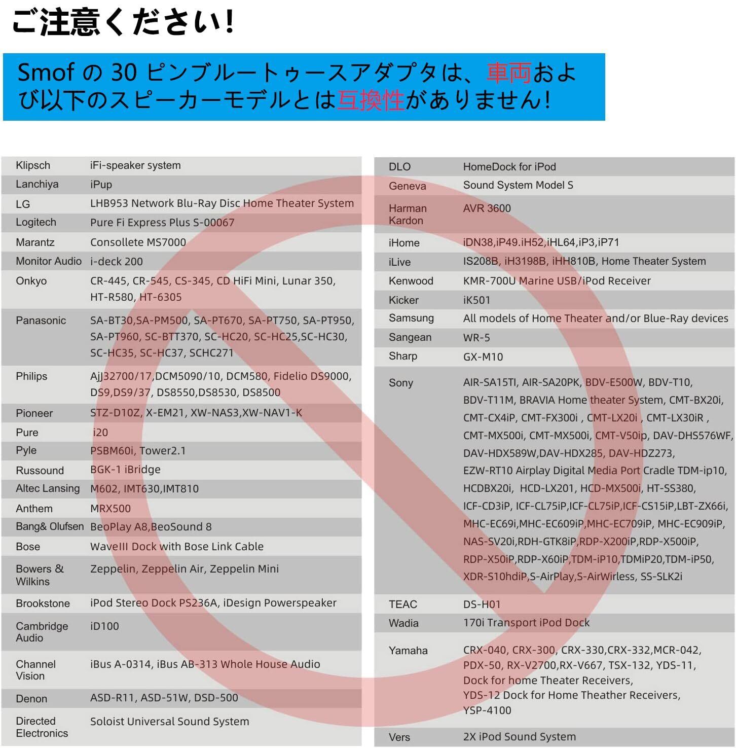 商品に付属されている3.5mm ミニプラグケーブルをスピーカーに接続した後、音楽ソースをAUXモードに設定する必要があります。 (設定方法がわからない場合は、スピーカーのメーカーと機種をお伝えいただければ、確認させていただきます。)もっと詳しい互換性に関する情報につきまして、最後の写真をご参考ください.製品をご利用際に音が出ないなどの問題がある場合は、お気軽に「出品者のコメント」出お問い合わせください。