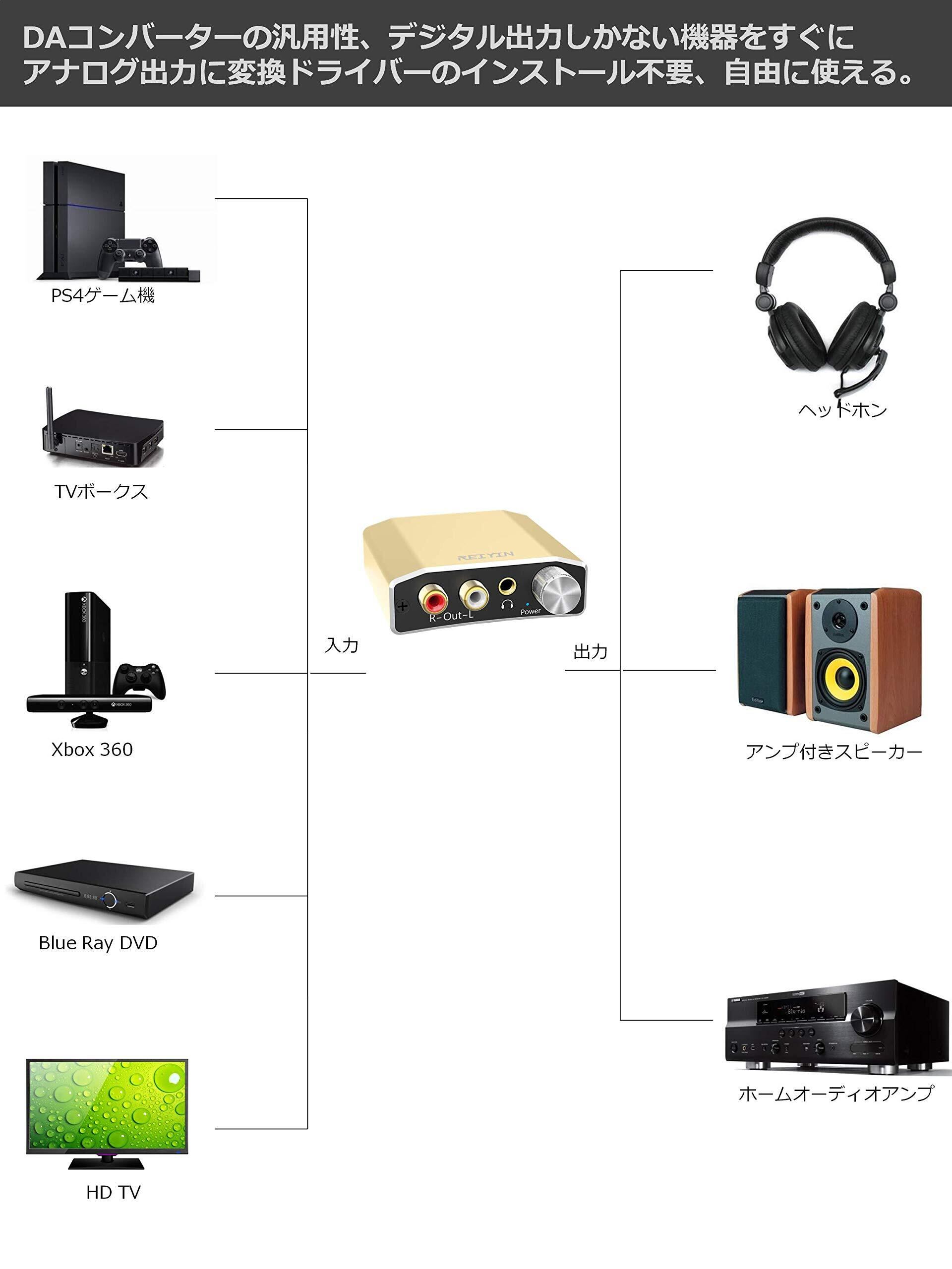 【高音質】ハイレゾデジタル音源192KHz(32~192KHzまで) 24bit(16~24bit)入力 を サポートし、本製品はデジタル信号(Optical&Coaxial)をアナログ信号(ヘッドホンジャック&2RCA)に変換できます。